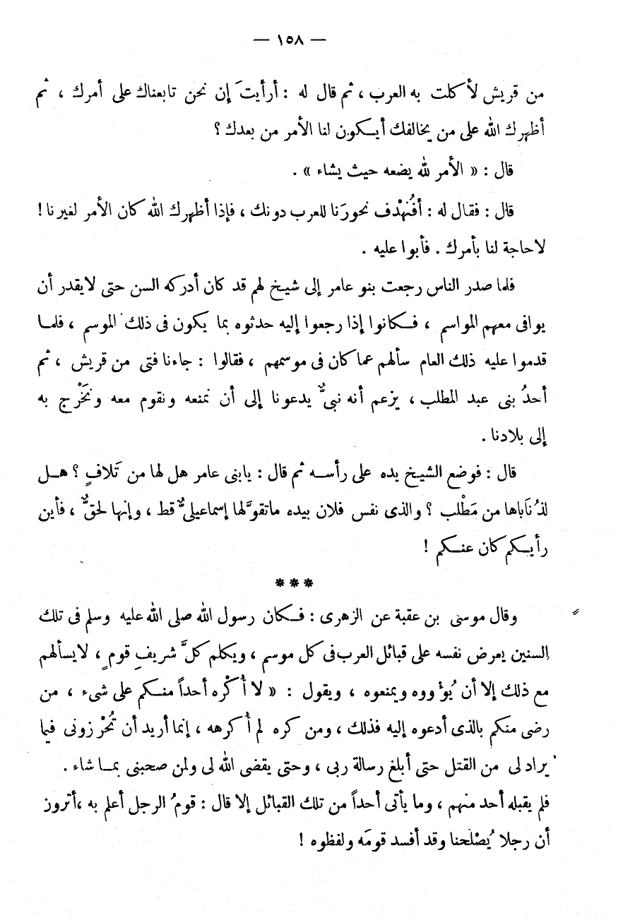 قَالَ: فَوَضَعَ الشَّيْخُ يَدَهُ عَلَى رَأْسِهِ ثُمَّ قَالَ: يَا بَنِي عَامِرٍ هَلْ لَهَا مِنْ تَلَافٍ؟ هَلْ لِذُنَابَاهَا مِنْ مَطْلَبٍ؟ وَالَّذِي نَفْسُ فُلَانٍ بِيَدِهِ مَا تَقَوَّلَهَا إِسْمَاعِيلِيٌّ قَطُّ، وَإِنَّهَا لَحَقٌّ، فَأَيْنَ رَأْيُكُمْ كَانَ عَنْكُمْ! * * * وَقَالَ مُوسَى بْنُ عُقْبَةَ عَنِ الزُّهْرِيِّ: فَكَانَ رَسُولُ اللَّهِ صَلَّى اللَّهُ عَلَيْهِ وَسَلَّمَ فِي تِلْكَ السِّنِينَ يَعْرِضُ نَفْسَهُ عَلَى قَبَائِلِ الْعَرَبِ فِي كُلِّ مَوْسِمٍ، وَيُكَلِّمُ كُلَّ شَرِيفِ قَوْمٍ، لَا يَسْأَلُهُمْ مَعَ ذَلِكَ إِلَّا أَنْ يُؤْوُوهُ وَيَمْنَعُوهُ، وَيَقُول: " لَا أكره أحدا مِنْكُم على شئ، مَنْ رَضِيَ مِنْكُمْ بِالَّذِي أَدْعُوهُ إِلَيْهِ فَذَلِكَ، وَمَنْ كَرِهَ لَمْ أُكْرِهْهُ، إِنَّمَا أُرِيدُ أَنْ تحرزوني فِيمَا يُرَاد لى مِنَ الْقَتْلِ حَتَّى أُبَلِّغَ رِسَالَةَ رَبِّي، وَحَتَّى يَقْضِيَ اللَّهُ لِي وَلِمَنْ صَحِبَنِي بِمَا شَاءَ.