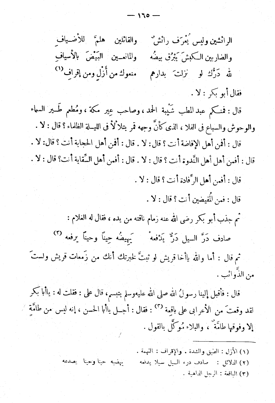 ثُمَّ جَذَبَ أَبُو بَكْرٍ رَضِيَ اللَّهُ عَنْهُ زِمَامَ نَاقَتِهِ مِنْ يَدِهِ، فَقَالَ لَهُ الْغُلَام: صَادف در السَّيْل در يَدْفَعهُ * يهيضه حينا وحينا يرفعهُ (3) ثُمَّ قَالَ: أَمَا وَاللَّهِ يَا أَخَا قُرَيْشٍ لَوْ ثَبَتَّ لَخَبَّرْتُكَ أَنَّكَ مِنْ زَمَعَاتِ قُرَيْشٍ وَلَسْتَ مِنَ الذَّوَائِبِ.