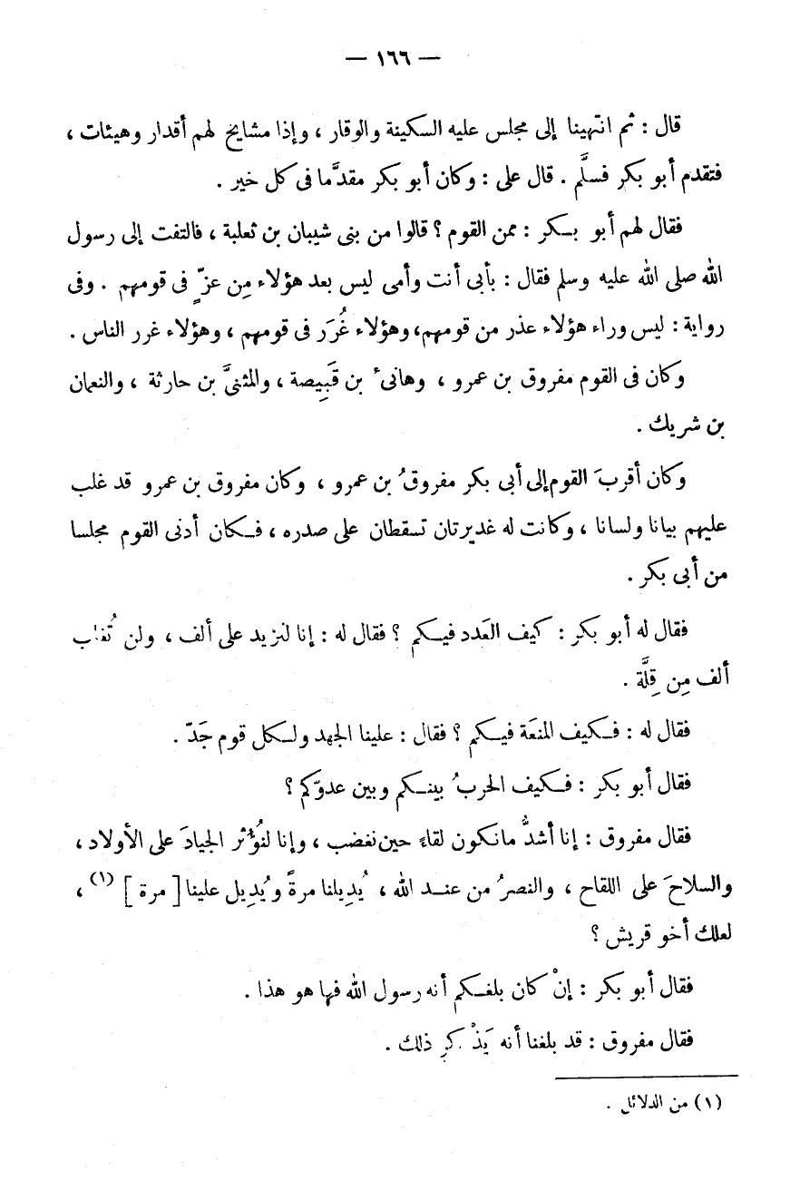 فَقَالَ أَبُو بَكْرٍ: فَكَيْفَ الْحَرْبُ بَيْنَكُمْ وَبَيْنَ عَدُوِّكُمْ؟ فَقَالَ مَفْرُوقٌ: إِنَّا أَشَدُّ مَا نَكُونُ لِقَاءً حِينَ نَغْضَبُ، وَإِنَّا لَنُؤْثِرُ الْجِيَادَ عَلَى الْأَوْلَادِ، وَالسِّلَاحَ عَلَى اللِّقَاحِ، وَالنَّصْرُ مِنْ عِنْدِ اللَّهِ، يُدِيلُنَا مَرَّةً وَيُدِيلُ عَلَيْنَا [مَرَّةً] (1) ، لَعَلَّكَ أَخُو قُرَيْشٍ؟ فَقَالَ أَبُو بَكْرٍ: إِن كَانَ بَلغَكُمْ أَنه رَسُول الله فَهَا هُوَ هَذَا.