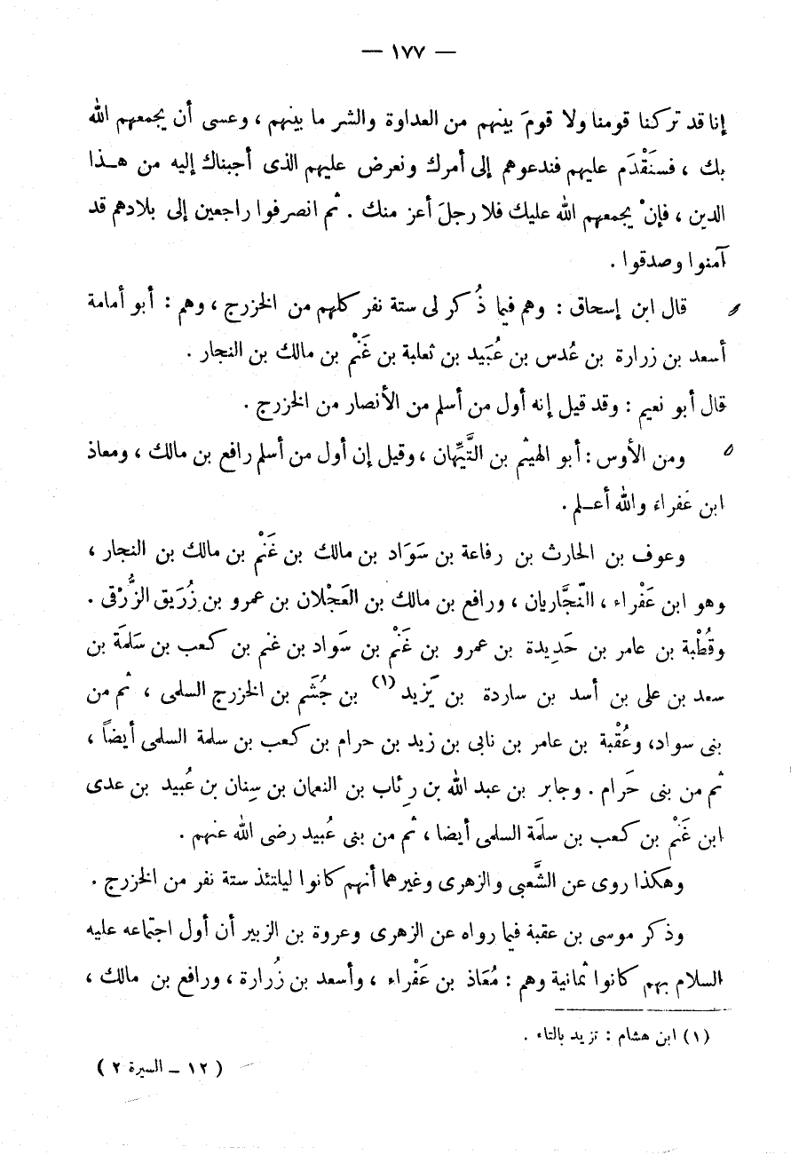 وَذَكَرَ مُوسَى بْنُ عُقْبَةَ فِيمَا رَوَاهُ عَنِ الزُّهْرِيِّ وَعُرْوَةَ بْنِ الزُّبَيْرِ أَنَّ أَوَّلَ اجْتِمَاعِهِ عَلَيْهِ السَّلَامُ بِهِمْ كَانُوا ثَمَانِيَةً وَهُمْ: مُعَاذُ بْنُ عَفْرَاءَ، وَأَسْعَدُ بْنُ زُرَارَةَ، وَرَافِعُ بْنُ مَالِكٍ،