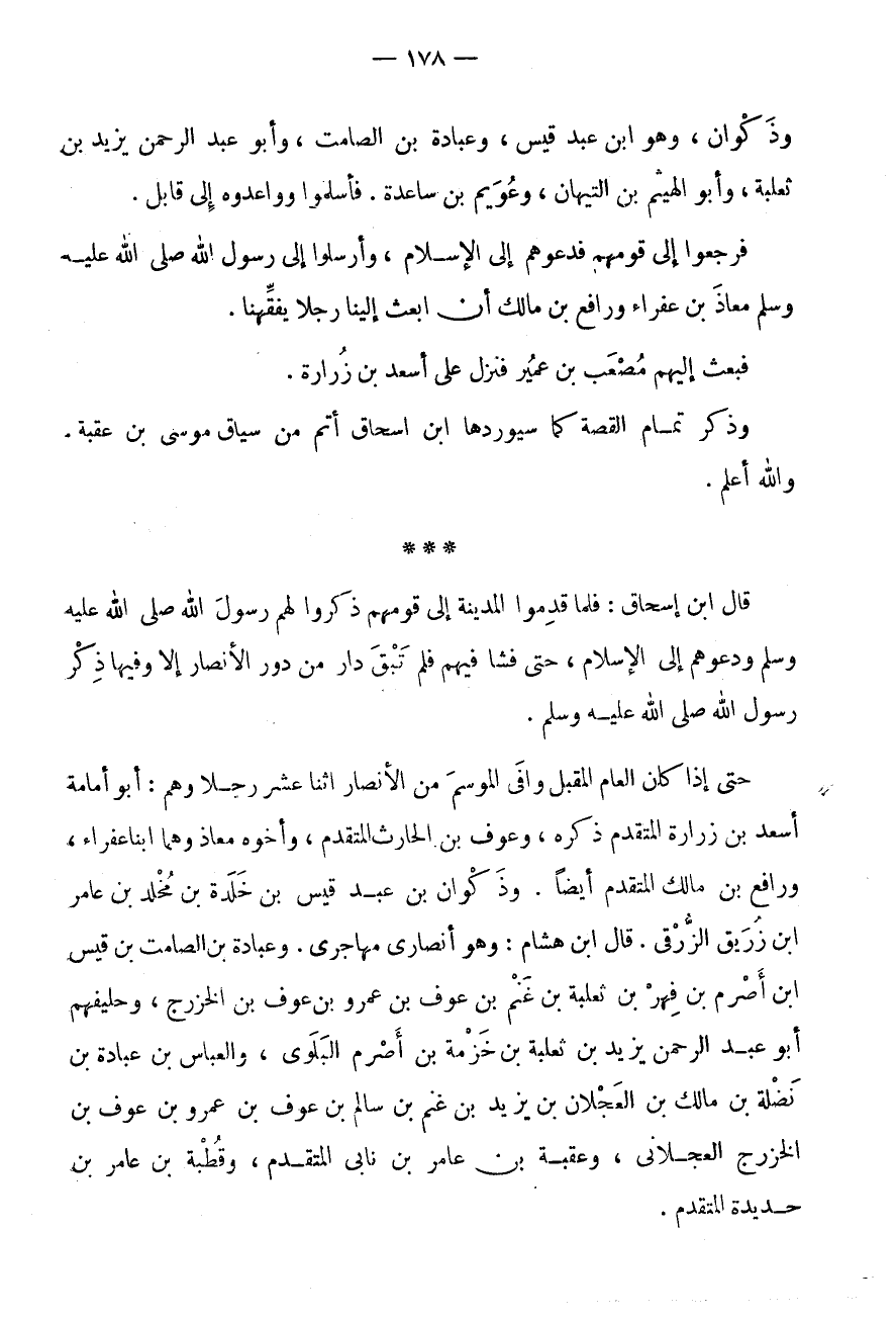 حَتَّى إِذَا كَانَ الْعَامُ الْمُقْبِلُ وَافَى الْمَوْسِمَ مِنَ الْأَنْصَارِ اثْنَا عَشَرَ رَجُلًا وَهُمْ: أَبُو أُمَامَةَ أَسْعَدُ بْنُ زُرَارَةَ الْمُتَقَدِّمُ ذِكْرُهُ، وَعَوْفُ بْنُ الْحَارِثِ الْمُتَقَدِّمُ، وَأَخُوهُ مُعَاذٌ وَهْمَا ابْنَا عَفْرَاءَ، وَرَافِعُ بْنُ مَالِكٍ الْمُتَقَدِّمُ أَيْضًا، وَذَكْوَانُ بْنُ عَبْدِ قَيْسِ بْنِ خَلْدَةَ بْنِ مخلد بن عَامر ابْن زُرَيْقٍ الزُّرَقِيُّ.