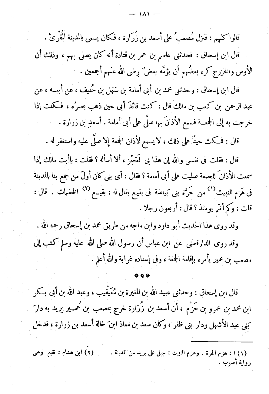 * * * قَالَ ابْنُ إِسْحَاقَ: وَحَدَّثَنِي عُبَيْدُ اللَّهِ بْنُ الْمُغِيرَةِ بْنِ مُعَيْقِيبٍ، وَعَبْدُ اللَّهِ بْنُ أَبى بكر ابْن مُحَمَّدِ بْنِ عَمْرِو بْنِ حَزْمٍ، أَنَّ أَسْعَدَ بْنَ زُرَارَةَ خَرَجَ بِمُصْعَبِ بْنِ عُمَيْرٍ يُرِيدُ بِهِ دَارَ بَنِي عَبْدِ الْأَشْهَلِ وَدَارَ بَنِي ظَفَرٍ، وَكَانَ سَعْدُ بْنُ مُعَاذٍ ابْنَ خَالَةِ أسعد بن زُرَارَة، فَدخل