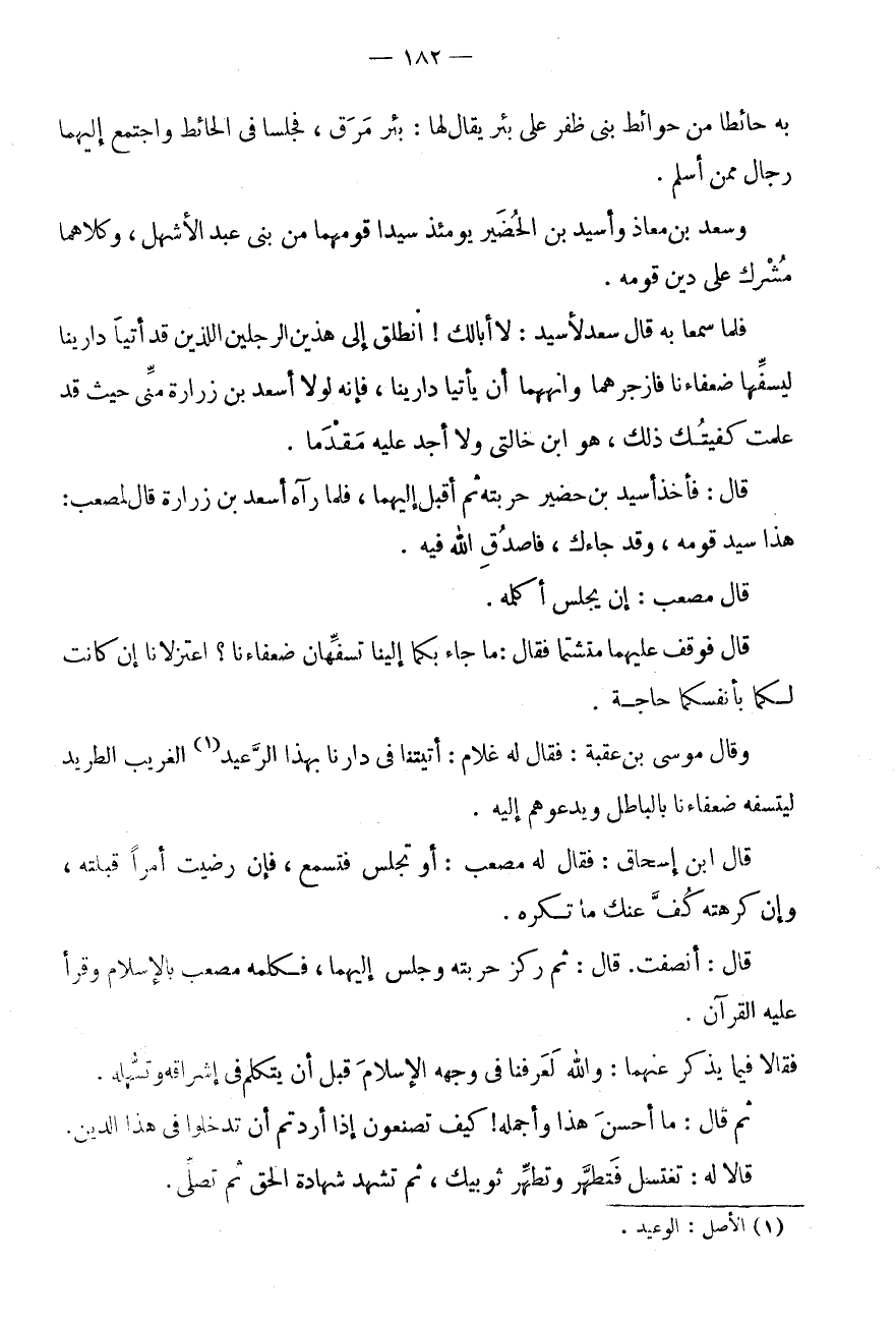 قَالَ: ثُمَّ رَكَّزَ حَرْبَتَهُ وَجَلَسَ إِلَيْهِمَا، فَكَلَّمَهُ مُصْعَبٌ بِالْإِسْلَامِ وَقَرَأَ عَلَيْهِ الْقُرْآنَ.
