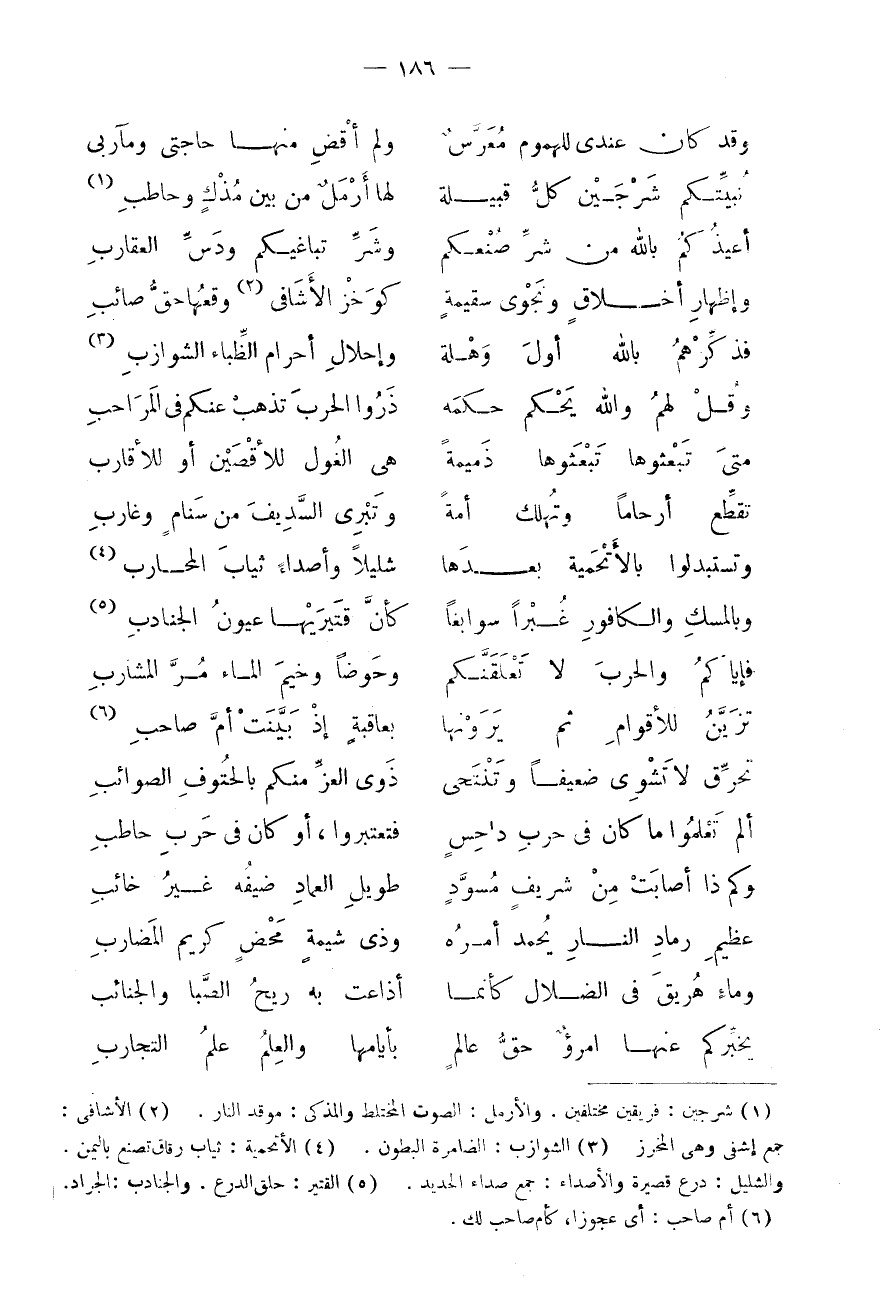 وَقَدْ كَانَ عِنْدِي لِلْهُمُومِ مُعَرَّسٌ * وَلَمْ أَقْضِ مِنْهَا حَاجَتِي وَمَآرِبِي نُبَيِّتُكُمْ شَرْجَيْنِ كُلُّ قَبِيلَةٍ * لَهَا أرمل مِنْ بَيْنِ مُذْكٍ وَحَاطِبِ (1) أُعِيذُكُمْ بِاللَّهِ مِنْ شَرِّ صُنْعِكُمْ * وَشَرِّ تَبَاغِيكُمْ وَدَسِّ الْعَقَارِبِ وَإِظْهَارِ أَخْلَاقٍ وَنَجْوَى سَقِيمَةٍ * كَوَخْزِ الْأَشَافِي (2) وَقْعُهَا حَقُّ صَائِبِ فَذَكِّرْهُمْ بِاللَّهِ أَوَّلَ وَهْلَةٍ * وَإِحْلَالِ إِحْرَامِ الظِّبِاءِ الشَّوَازِبِ (3) وَقُلْ لَهُمُ وَاللَّهُ يَحْكُمُ حُكْمَهُ * ذَرُوا الْحَرْبَ تَذْهَبْ عَنْكُمُ فِي الْمَرَاحِبِ مَتَى تَبْعَثُوهَا تَبْعَثُوهَا ذَمِيمَةً * هِيَ الْغَوْلُ لِلْأَقْصَيْنَ أَوْ لِلْأَقَارِبِ تُقَطِّعُ أَرْحَامًا وَتُهْلِكُ أُمَّةً * وَتَبْرِي السَّدِيفَ مِنْ سَنَامٍ وَغَارِبِ