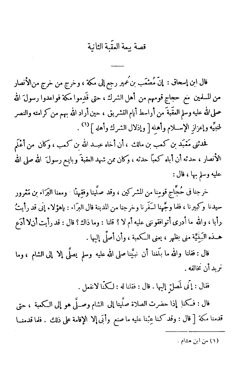 قِصَّةُ بَيْعَةِ الْعَقَبَةِ الثَّانِيَةِ قَالَ ابْنُ إِسْحَاقَ: إِنَّ مُصْعَبَ بْنَ عُمَيْرٍ رَجَعَ إِلَى مَكَّةَ، وَخَرَجَ مَنْ خَرَجَ مِنَ الْأَنْصَارِ مِنَ الْمُسْلِمِينَ مَعَ حُجَّاجِ قَوْمِهِمْ مِنْ أَهْلِ الشِّرْكِ، حَتَّى قَدِمُوا مَكَّةَ فَوَاعَدُوا رَسُولَ اللَّهِ صَلَّى اللَّهُ عَلَيْهِ وَسَلَّمَ الْعَقَبَةَ مِنْ أَوَاسِطِ أَيَّامِ التَّشْرِيقِ، حِينَ أَرَادَ اللَّهُ بِهِمْ مِنْ كَرَامَتِهِ وَالنَّصْرِ لنَبيه وإعزاز الاسلام وَأَهله [وإذلال الشّرك وَأَهْلِهِ] (1) .