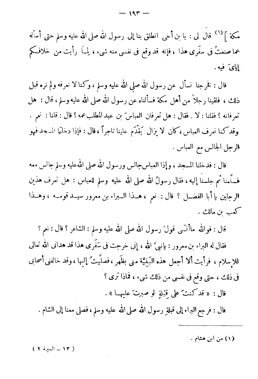 مَكَّة] (1) قَالَ لى: يَا بن أَخِي انْطَلِقْ بِنَا إِلَى رَسُولِ اللَّهِ صَلَّى اللَّهُ عَلَيْهِ وَسَلَّمَ حَتَّى أَسْأَلَهُ عَمَّا صَنَعْتُ فِي سَفَرِي هَذَا، فَإِنَّهُ قَدْ وَقَعَ فِي نَفسِي مِنْهُ شئ، لِمَا رَأَيْتُ مِنْ خِلَافِكُمْ إِيَّايَ فِيهِ.