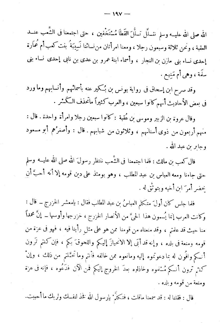 اللَّهِ صَلَّى اللَّهُ عَلَيْهِ وَسَلَّمَ نَتَسَلَّلُ تَسَلُّلَ الْقَطَا مُسْتَخْفِينَ، حَتَّى اجْتَمَعْنَا فِي الشِّعْبِ عِنْدَ الْعَقَبَةِ، وَنَحْنُ ثَلَاثَةٌ وَسَبْعُونَ رَجُلًا، وَمَعَنَا امْرَأَتَانِ مِنْ نِسَائِنَا نَسِيبَةُ بِنْتُ كَعْبٍ أُمُّ عُمَارَةَ إِحْدَى نِسَاءِ بَنِي مَازِنِ بْنِ النَّجَّارِ، وَأَسْمَاءُ ابْنَةُ عَمْرِو بْنِ عَدِيِّ بْنِ نَابِي إِحْدَى نِسَاءِ بَنِيَ سَلِمَةَ، وَهِيَ أُمُّ مَنِيعٍ.