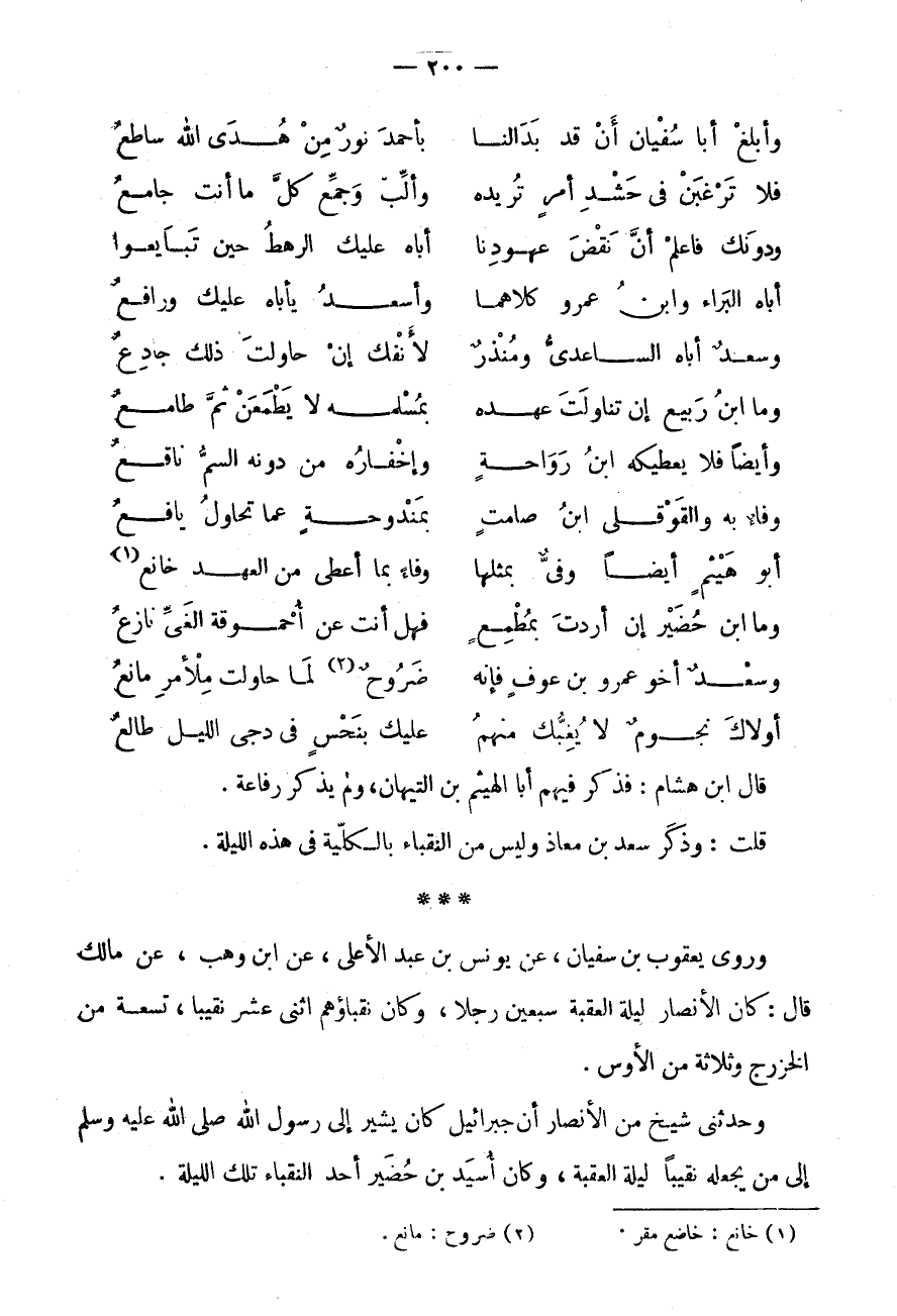 وأبلغ أَبَا سُفْيَان أَن قد بدالنا * بِأَحْمَدَ نُورٌ مِنْ هُدَى اللَّهِ سَاطِعُ فَلَا ترغبن فِي حَشْدِ أَمْرٍ تُرِيدُهُ * وَأَلِّبْ وَجَمِّعْ كُلَّ مَا أَنْتَ جَامِعُ وَدُونَكَ فَاعْلَمْ أَنَّ نَقْضَ عُهُودنَا * أَبَاهُ عَلَيْك الرَّهْط حِين تبايعوا أَبَاهُ الْبَرَاءُ وابْنُ عَمْرٍو كِلَاهُمَا * وَأَسْعَدُ يَأْبَاهُ عَلَيْكَ وَرَافِعُ وَسَعْدٌ أَبَاهُ السَّاعِدِيُّ وَمُنْذِرٌ * لِأَنْفِكَ إِنْ حَاوَلْتَ ذَلِكَ جَادِعُ وَمَا ابْنُ رِبِيعٍ إِنْ تَنَاوَلْتَ عَهْدَهُ * بِمُسْلِمِهِ لَا يَطْمَعَنْ ثَمَّ طَامِعُ وَأَيْضًا فَلَا يُعْطِيكَهُ ابْنُ رَوَاحَةٍ * وَإِخْفَارُهُ مِنْ دُونِهِ السُّمُّ نَاقِعُ وَفَاءً بِهِ وَالْقَوْقَلِيُّ ابْن صَامِتٍ * بِمَنْدُوحَةٍ عَمَّا تُحَاوِلُ يَافِعُ أَبُو هَيْثَمٍ أَيْضًا وَفِيٌّ بِمِثْلِهَا * وَفَاءً بِمَا أَعْطَى مِنَ الْعَهْدِ خَانِعُ (1) وَمَا ابْنُ حُضَيْرٍ إِنْ أَرَدْتَ بِمَطْمَعٍ * فَهَلْ أَنْتَ عَنْ أُحْمُوقَةِ الْغَيِّ نَازِعُ وَسَعْدٌ أَخُو عَمْرِو بْنِ عَوْفٍ فَإِنَّهُ * ضَرُوحٌ (2) لِمَا حَاوَلْتَ مِلْأَمْرِ مَانِعُ أُولَاكَ نُجُومٌ لَا يُغِبُّكَ مِنْهُمُ * عَلَيْكَ بِنَحْسٍ فِي دُجَى اللَّيْلِ طَالِعُ