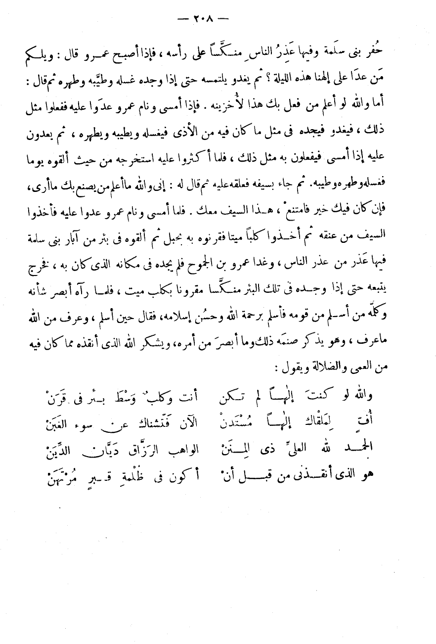 فَلَمَّا أَمْسَى ونام عَمْرو وعدوا عَلَيْهِ فَأَخَذُوا السَّيْفَ مِنْ عُنُقِهِ ثُمَّ أَخَذُوا كَلْبًا مَيِّتًا فَقَرَنُوهُ بِهِ بِحَبْلٍ ثُمَّ ألْقَوْهُ فِي بِئْرٍ مِنْ آبَارِ بَنِي سَلِمَةَ فِيهَا عِذَرٌ مِنْ عِذَرِ النَّاسِ، وَغَدَا عَمْرُو بْنُ الْجَمُوحِ فَلَمْ يَجِدْهُ فِي مَكَانِهِ الَّذِي كَانَ بِهِ، فَخَرَجَ يَتَّبِعُهُ حَتَّى إِذَا وَجَدَهُ فِي تِلْكَ الْبِئْرِ مُنَكَّسًا مَقْرُونًا بِكَلْبٍ مَيِّتٍ، فَلَمَّا رَآهُ أَبْصَرَ شَأْنَهُ وَكَلَّمَهُ مَنْ أَسْلَمَ مِنْ قَوْمِهِ فَأَسْلَمَ بِرَحْمَةِ اللَّهِ وَحَسُنَ إِسْلَامُهُ، فَقَالَ حِينَ أَسْلَمَ، وَعَرَفَ مِنَ اللَّهِ مَا عَرَفَ، وَهُوَ يَذْكُرُ صَنَمَهُ ذَلِكَ وَمَا أَبْصَرَ مِنْ أَمْرِهِ، وَيَشْكُرُ اللَّهَ الَّذِي أَنْقَذَهُ مِمَّا كَانَ فِيهِ من الْعَمى والضلالة وَيَقُول: وَاللَّهِ لَوْ كُنْتَ إِلَهًا لَمْ تَكُنْ * أَنْتَ وَكَلْبٌ وَسْطَ بِئْرٍ فِي قَرَنْ أُفٍّ لِمَلْقَاكَ إِلَهًا مُسْتَدَنْ * الْآنَ فَتَّشْنَاكَ عَنْ سُوءِ الْغَبَنْ الْحَمْدُ لِلَّهِ الْعَلِيِّ ذِي الْمِنَنْ * الْوَاهِبِ الرَّزَّاقِ دَيَّانِ الدِّيَنْ هُوَ الَّذِي أَنْقَذَنِي مِنْ قَبْلِ أَنْ * أَكُونَ فِي ظُلْمَةِ قَبْرٍ مُرْتَهَنْ