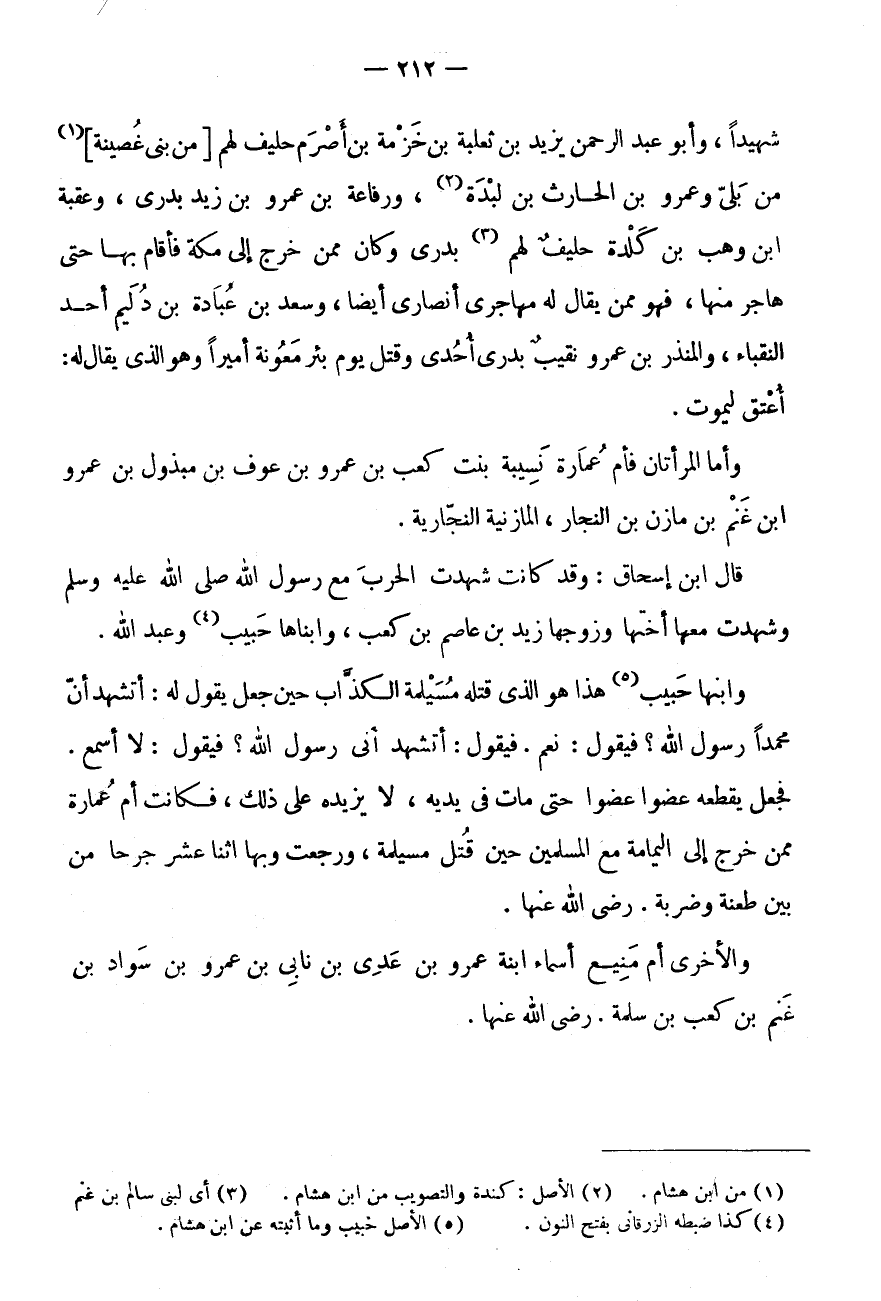 وَأَمَّا الْمَرْأَتَانِ فَأُمُّ عُمَارَةَ نَسِيبَةُ بِنْتُ كَعْبِ بْنِ عَمْرِو بْنِ عَوْفِ بْنِ مَبْذُولِ بن عَمْرو ابْن غَنْمِ بْنِ مَازِنِ بْنِ النَّجَّارِ، الْمَازِنِيَّةُ النَّجَّارِيَّةُ.