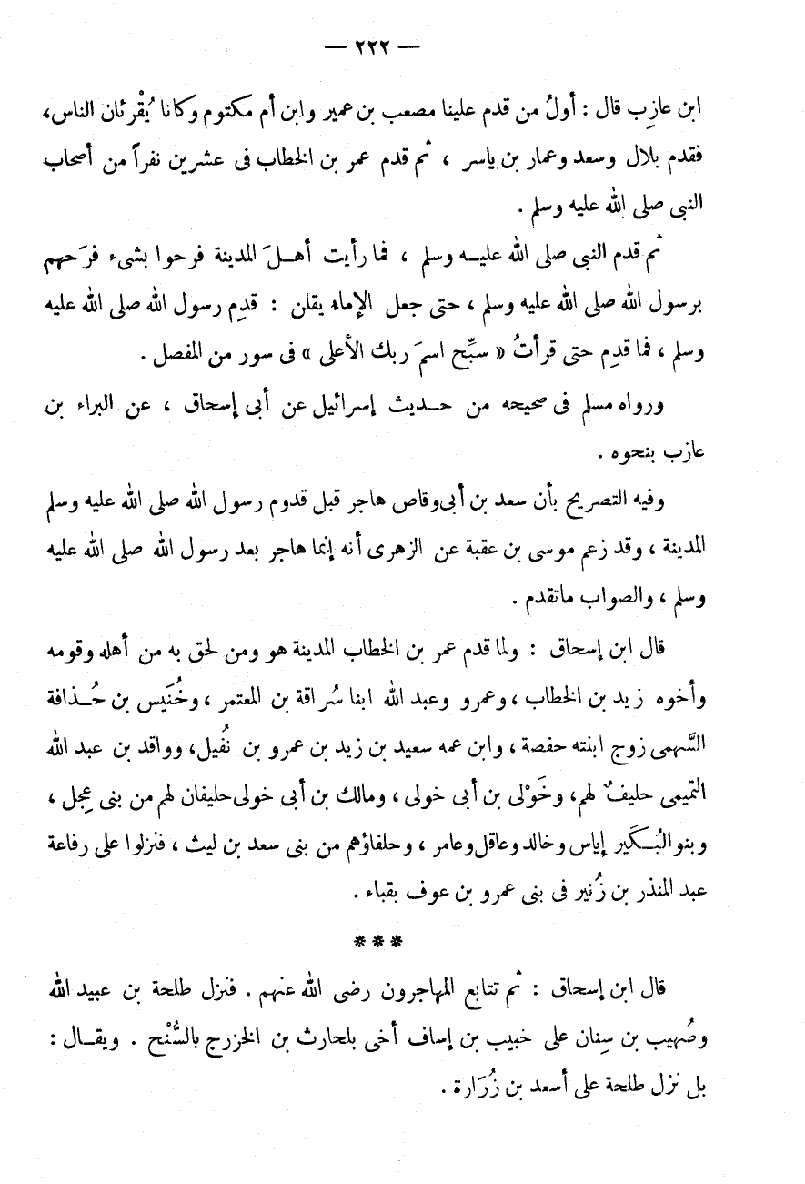 ابْن عَازِبٍ قَالَ: أَوَّلُ مَنْ قَدِمَ عَلَيْنَا مُصْعَبُ بْنُ عُمَيْرٍ وَابْنُ أُمِّ مَكْتُومٍ وَكَانَا يُقْرِئَانِ النَّاسَ، فَقَدِمَ بِلَالٌ وَسَعْدٌ وَعَمَّارُ بْنُ يَاسِرٍ، ثُمَّ قَدِمَ عُمَرُ بْنُ الْخَطَّابِ فِي عِشْرِينَ نَفرا مِنْ أَصْحَابِ النَّبِيِّ صَلَّى اللَّهُ عَلَيْهِ وَسَلَّمَ.
