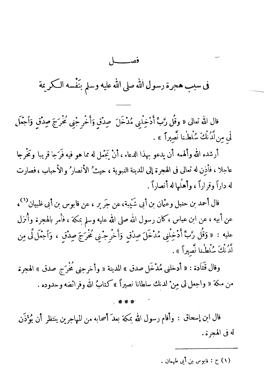 فَصَلٌ فِي سَبَبِ هِجْرَةِ رَسُولِ اللَّهِ صَلَّى اللَّهُ عَلَيْهِ وَسَلَّمَ بِنَفْسِهِ الْكَرِيمَةِ قَالَ اللَّهُ تَعَالَى " وَقُلْ رَبِّ أَدْخِلْنِي مُدْخَلَ صِدْقٍ وَأَخْرِجْنِي مُخْرَجَ صدق وَاجعَل لى من لَدُنْك سلطنا نَصِيرًا ".