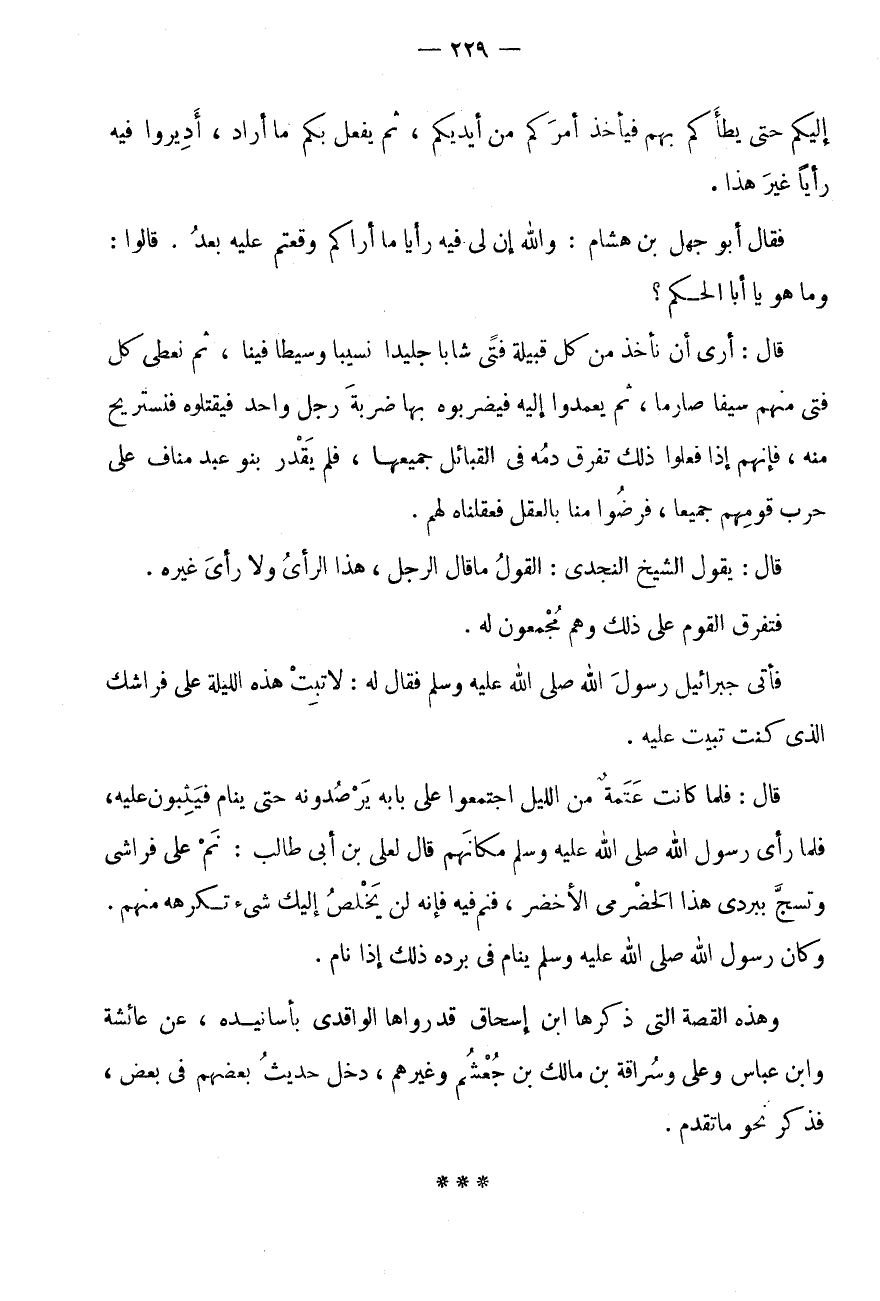 قَالَ: فَلَمَّا كَانَتْ عَتَمَةٌ مِنَ اللَّيْلِ اجْتَمَعُوا عَلَى بَابِهِ يَرْصُدُونَهُ حَتَّى يَنَامُ فَيَثِبُونَ عَلَيْهِ، فَلَمَّا رَأَى رَسُولُ اللَّهِ صَلَّى اللَّهُ عَلَيْهِ وَسَلَّمَ مَكَانَهُمْ قَالَ لِعَلِيِّ بْنِ أَبِي طَالِبٍ: نَمْ عَلَى فِرَاشِي وَتَسَجَّ بِبُرْدِي هَذَا الْحَضْرَمِيِّ الْأَخْضَرِ، فَنَمْ فِيهِ فَإِنَّهُ لن يخلص إِلَيْك شئ تَكْرَهُهُ مِنْهُمْ.