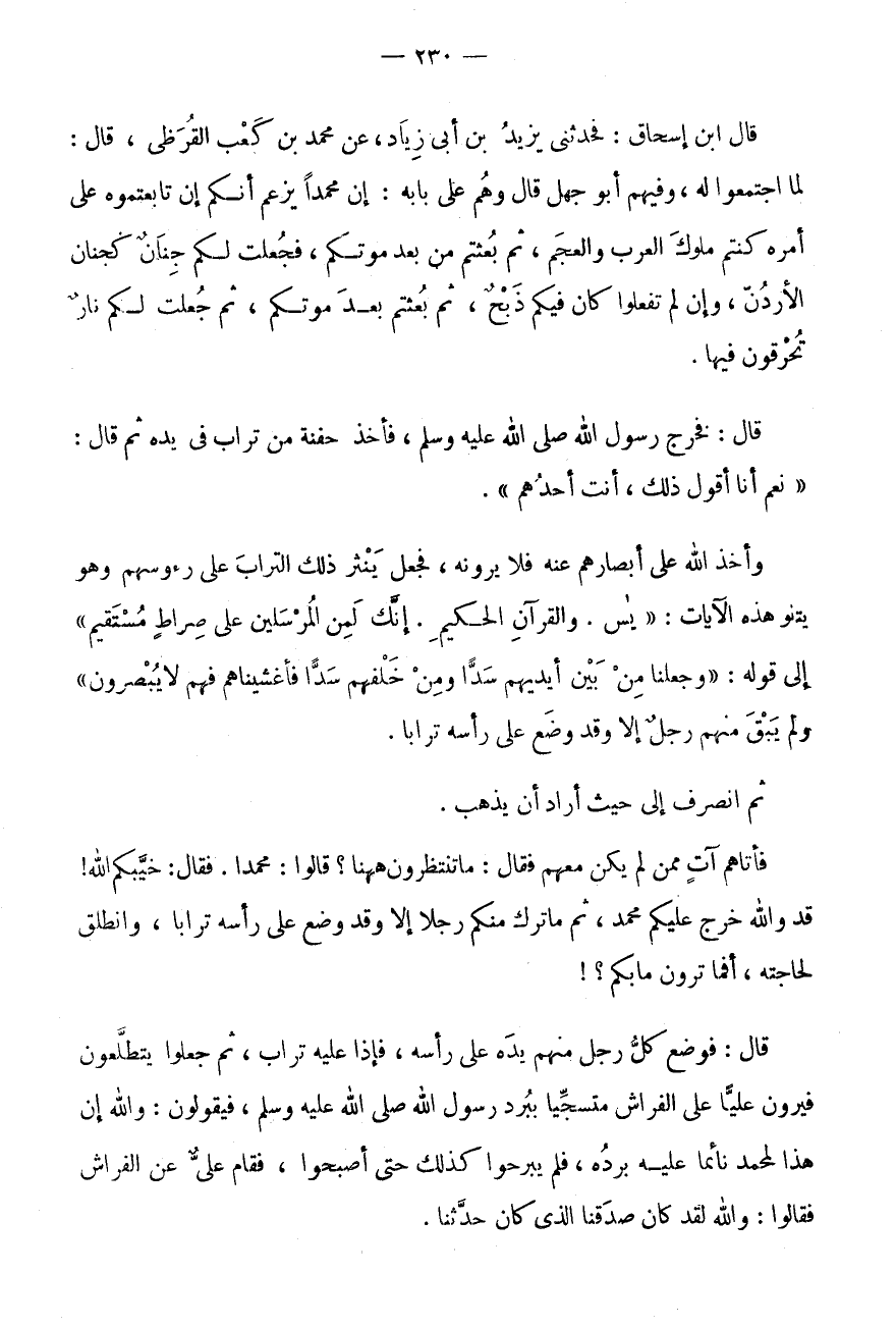قَدْ وَاللَّهِ خَرَجَ عَلَيْكُمْ مُحَمَّدٌ، ثُمَّ مَا تَرَكَ مِنْكُمْ رَجُلًا إِلَّا وَقَدْ وَضَعَ عَلَى رَأْسِهِ تُرَابًا، وَانْطَلَقَ لِحَاجَتِهِ، أَفَمَا تَرَوْنَ مَا بِكُمْ؟ ! قَالَ: فَوَضَعَ كُلُّ رَجُلٍ مِنْهُمْ يَدَهُ عَلَى رَأْسِهِ، فَإِذَا عَلَيْهِ تُرَابٌ، ثُمَّ جَعَلُوا يَتَطَلَّعُونَ فَيَرَوْنَ عَلِيًّا عَلَى الْفِرَاشِ مُتَسَجِّيًا بِبُرْدِ رَسُولِ اللَّهِ صَلَّى اللَّهُ عَلَيْهِ وَسَلَّمَ، فَيَقُولُونَ: وَاللَّهِ إِنَّ هَذَا لَمُحَمَّدٌ نَائِمًا عَلَيْهِ بُرْدُهُ، فَلَمْ يَبْرَحُوا كَذَلِكَ حَتَّى أَصْبَحُوا، فَقَامَ عَلِيٌّ عَنِ الْفِرَاشِ فَقَالُوا: وَاللَّهِ لَقَدْ كَانَ صَدَقَنَا الَّذِي كَانَ حَدثنَا.