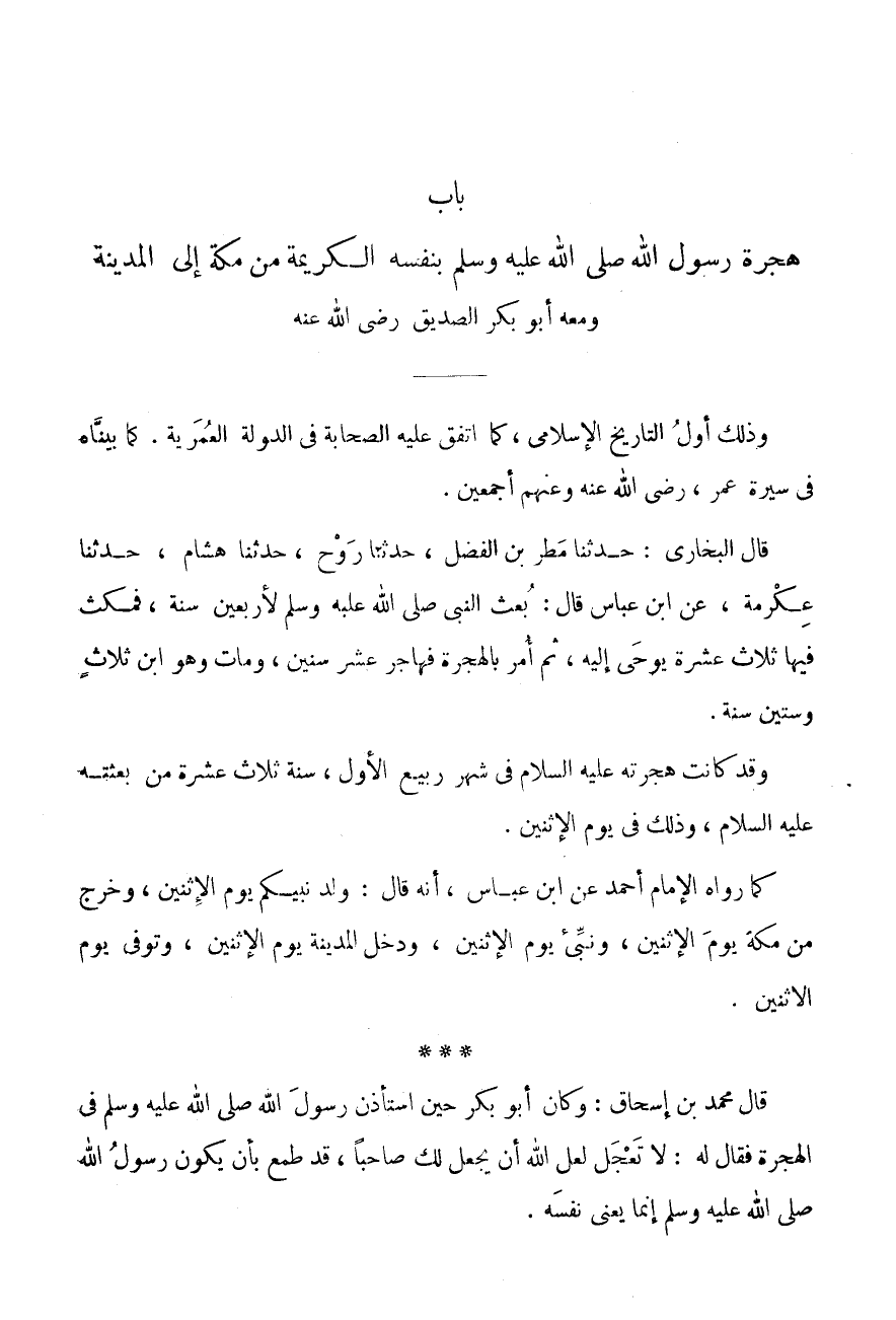 وَمَعَهُ أَبُو بَكْرٍ الصِّدِّيقُ رَضِيَ اللَّهُ عَنْهُ وَذَلِكَ أَوَّلُ التَّارِيخِ الْإِسْلَامِيِّ، كَمَا اتَّفَقَ عَلَيْهِ الصَّحَابَةُ فِي الدَّوْلَةِ الْعُمَرِيَّةِ.