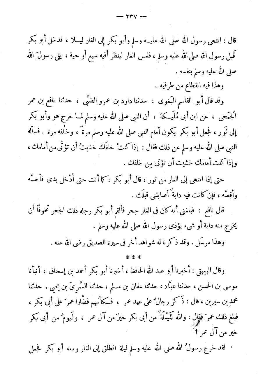 * * * وَقَالَ الْبَيْهَقِيُّ: أَخْبَرَنَا أَبُو عَبْدِ اللَّهِ الْحَافِظُ، أَخْبَرَنَا أَبُو بكر أَحْمد بن إِسْحَاق، أَنبأَنَا مُوسَى بن الْحسن، حَدثنَا عباد، حَدثنَا عَفَّان بن مُسلم، حَدثنَا السرى بن يحيى، حَدثنَا مُحَمَّدُ بْنُ سِيرِينَ، قَالَ: ذَكَرَ رِجَالٌ عَلَى عَهْدِ عُمْرَ، فَكَأَنَّهُمْ فَضَّلُوا عُمَرَ عَلَى أَبِي بَكْرٍ، فَبَلَغَ ذَلِكَ عُمَرَ فَقَالَ: وَاللَّهِ لَلَيْلَةٌ مِنْ أَبِي بَكْرٍ خَيْرٌ مِنْ آلِ عُمَرَ، وَلَيَوْمٌ مِنْ أَبِي بَكْرٍ خَيْرٌ مِنْ آلِ عُمَرَ! لَقَدْ خَرَجَ رَسُولُ اللَّهِ صَلَّى اللَّهُ عَلَيْهِ وَسَلَّمَ لَيْلَةَ انْطَلَقَ إِلَى الْغَارِ وَمَعَهُ أَبُو بَكْرٍ فَجَعَلَ