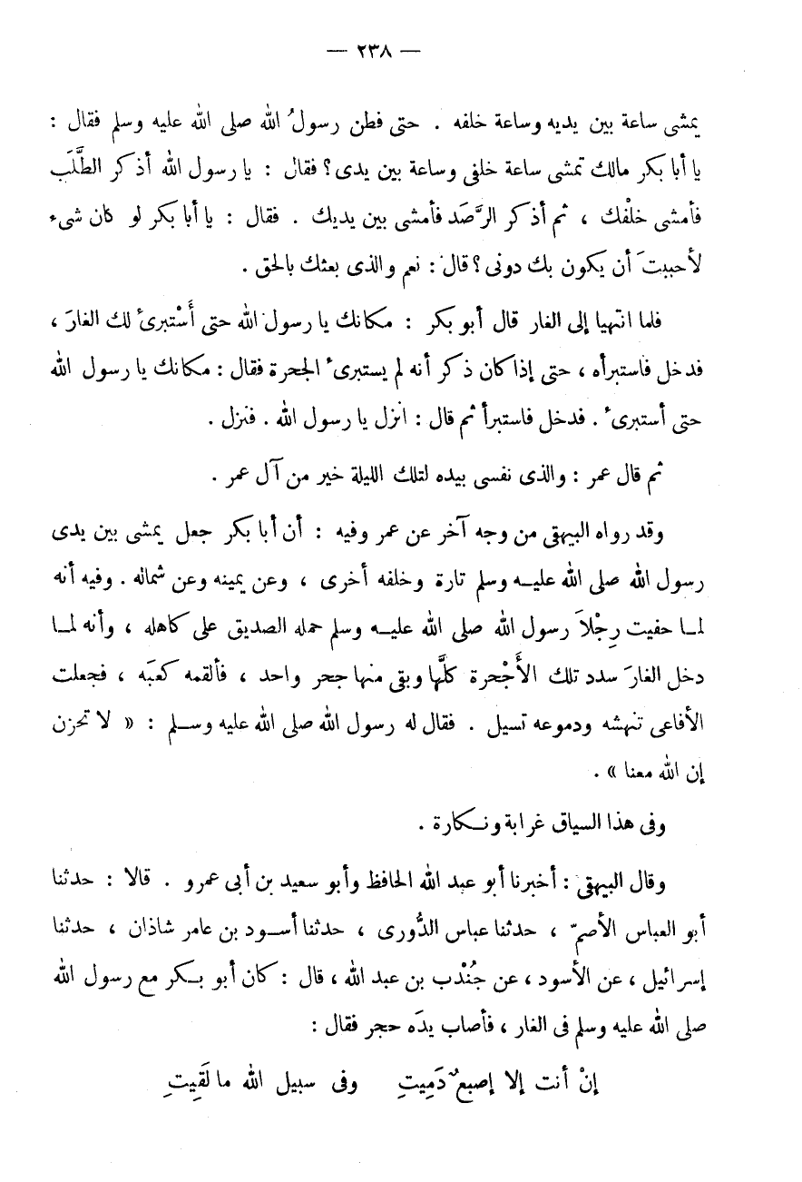 قَالَا: حَدَّثَنَا أَبُو الْعَبَّاس الاصم، حَدثنَا عَبَّاس الدوري، حَدثنَا أسود بن عَامر شَاذان، حَدثنَا إِسْرَائِيلُ، عَنِ الْأَسْوَدِ، عَنْ جُنْدُبِ بْنِ عَبْدِ اللَّهِ، قَالَ: كَانَ أَبُو بَكْرٍ مَعَ رَسُولِ اللَّهِ صَلَّى اللَّهُ عَلَيْهِ وَسَلَّمَ فِي الْغَارِ، فَأَصَابَ يَدَهُ حَجَرٌ فَقَالَ: إِنْ أَنْتِ إِلَّا أصْبع دميت * وَفِي سَبِيل الله مَا لقِيت