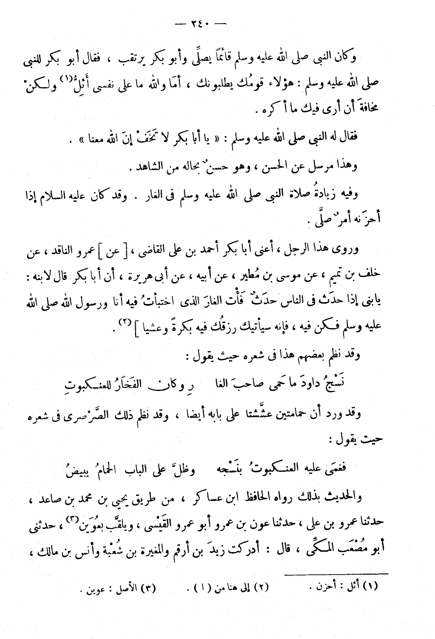 وَقَدْ نَظَمَ بَعْضُهُمْ هَذَا فِي شِعْرِهِ حَيْثُ يَقُولُ: نَسْجُ دَاوُدَ مَا حَمَى صَاحِبَ الْغَا * رِ وَكَانَ الْفَخَارُ لِلْعَنْكَبُوتِ وَقَدْ وَرَدَ أَنَّ حَمَامَتَيْنِ عَشَّشَتَا عَلَى بَابِهِ أَيْضًا، وَقَدْ نَظَمَ ذَلِكَ الصَّرْصَرِيُّ فِي شِعْرِهِ حَيْثُ يَقُولُ: فَغَمَّى عَلَيْهِ الْعَنْكَبُوتُ بِنَسْجِهِ * وَظَلَّ عَلَى الْبَابِ الْحَمَامُ يَبِيضُ