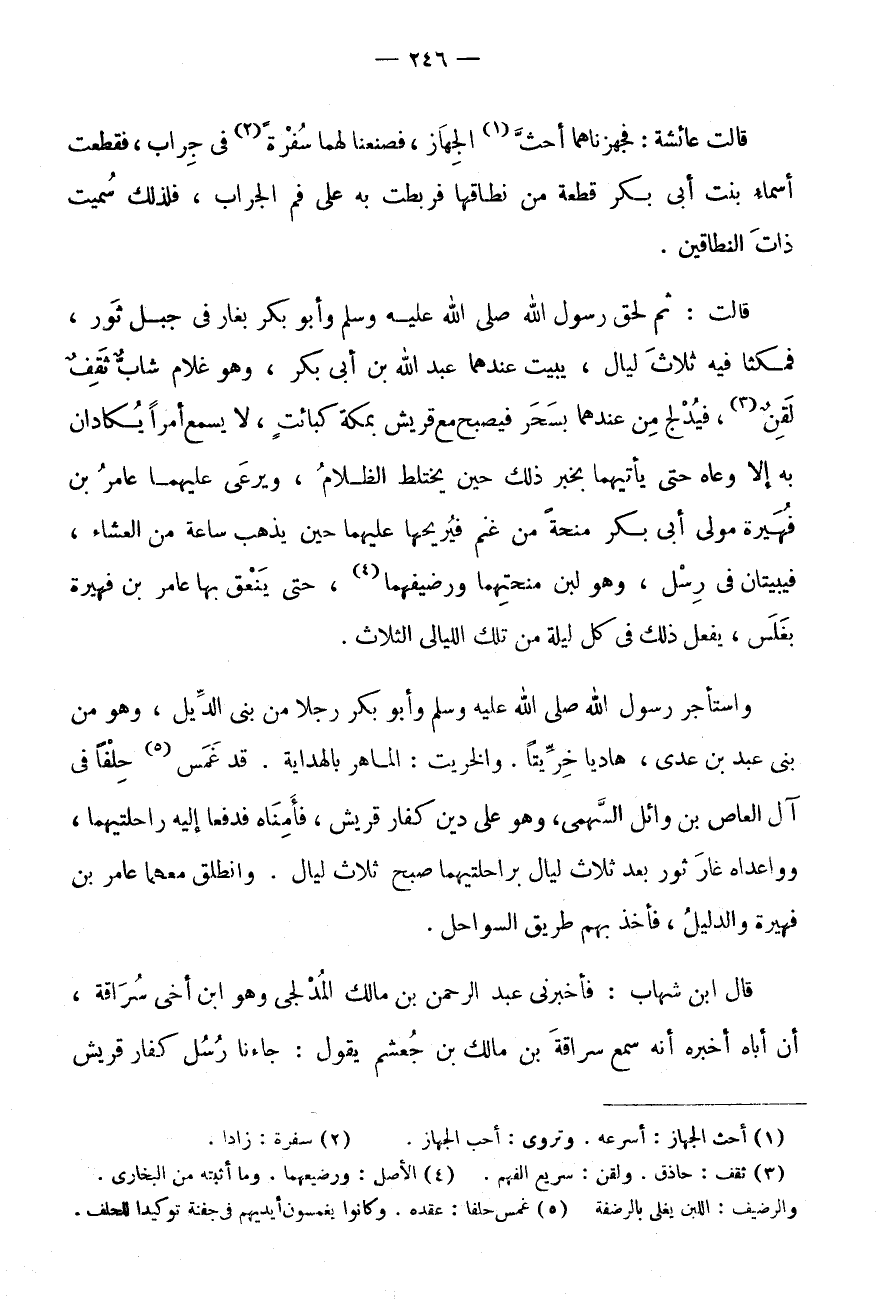 قَالَتْ عَائِشَةُ: فَجَهَّزْنَاهُمَا أَحَثَّ (1) الْجَهَازِ، فَصَنَعْنَا لَهُمَا سُفْرَةً (2) فِي جِرَابٍ، فَقَطَعَتْ أَسْمَاءُ بِنْتُ أَبِي بكر قِطْعَة من نطاقها بِهِ عَلَى فَمِ الْجِرَابِ، فَلِذَلِكَ سُمِّيَتْ ذَاتَ النِّطَاقَيْنِ.