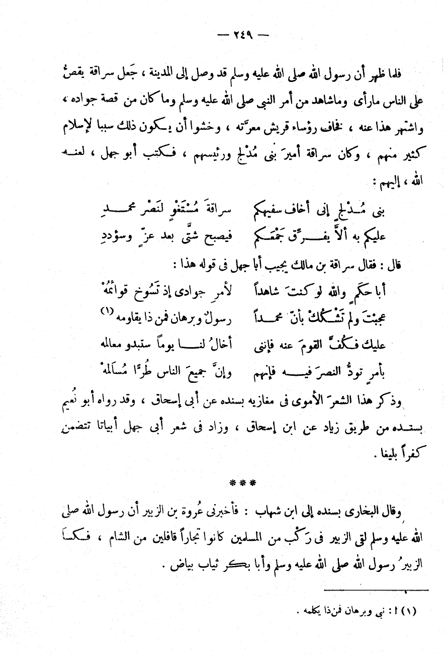 فَلَمَّا ظَهَرَ أَنَّ رَسُولَ اللَّهِ صَلَّى اللَّهُ عَلَيْهِ وَسَلَّمَ قَدْ وَصَلَ إِلَى الْمَدِينَةِ، جَعَلَ سُرَاقَةُ يَقُصُّ عَلَى النَّاسِ مَا رَأَى وَمَا شَاهَدَ مِنْ أَمْرِ النَّبِيِّ صَلَّى اللَّهُ عَلَيْهِ وَسَلَّمَ وَمَا كَانَ من قصَّة جَوَادِهِ، وَاشْتُهِرَ هَذَا عَنْهُ، فَخَافَ رُؤَسَاءُ قُرَيْشٍ مَعَرَّتَهُ، وَخَشُوا أَنْ يَكُونَ ذَلِكَ سَبَبًا لِإِسْلَامِ كَثِيرٍ مِنْهُمْ، وَكَانَ سُرَاقَةُ أَمِيرَ بَنِي مُدْلَجٍ وَرَئِيسَهُمْ، فَكَتَبَ أَبُو جَهْلٍ، لَعَنَهُ اللَّهُ، إِلَيْهِمْ: بَنِي مُدْلِجٍ إِنِّي أَخَافُ سَفِيهَكُمْ * سُرَاقَةَ مُسْتَغْوٍ لِنَصْرِ مُحَمَّدِ عَلَيْكُمْ بِهِ أَلَّا يُفَرِّقَ جَمْعَكُمْ * فَيُصْبِحَ شَتَّى بَعْدَ عِزٍّ وَسُؤْدُدِ قَالَ: فَقَالَ سُرَاقَةُ بْنُ مَالِكٍ يُجِيبُ أَبَا جَهْلٍ فِي قَوْلِهِ هَذَا: أَبَا حَكَمٍ وَاللَّهِ لَوْ كُنْتَ شَاهِدًا * لِأَمْرِ جَوَادِي إِذْ تَسُوخُ قَوَائِمُهْ عَجِبْتَ وَلَمْ تَشْكُكْ بِأَنَّ مُحَمَّدًا * رَسُولٌ وَبُرْهَانٌ فَمَنْ ذَا يقاومه (1) عَلَيْك فَكف الْقَوْمِ عَنْهُ فَإِنَّنِي * إِخَالُ لَنَا يَوْمًا سَتَبْدُو مَعَالِمُهْ بِأَمْرٍ تَوَدُّ النَّصْرَ فِيهِ فَإِنَّهُمْ * وَإِنَّ جَمِيعَ النَّاسِ طُرًّا مُسَالِمُهْ وَذَكَرَ هَذَا الشِّعْرَ الاموى فِي مغازيه بِسَنَدِهِ عَن أَبى إِسْحَاقَ، وَقَدْ رَوَاهُ أَبُو نُعَيْمٍ بِسَنَدِهِ مِنْ طَرِيقِ زِيَادٍ عَنِ ابْنِ إِسْحَاقَ، وَزَادَ فِي شعر أَبى جهل أَبْيَاتًا تَتَضَمَّنُ كُفْرًا بَلِيغًا * * * وَقَالَ الْبُخَارِيُّ بِسَنَدِهِ إِلَى ابْنِ شِهَابٍ: فَأَخْبَرَنِي عُرْوَةُ بْنُ الزُّبَيْرِ أَنَّ رَسُولَ اللَّهِ صَلَّى اللَّهُ عَلَيْهِ وَسَلَّمَ لَقِيَ الزُّبَيْرَ فِي رَكْبٍ مِنَ الْمُسْلِمِينَ كَانُوا تُجَّارًا قَافِلِينَ مِنَ الشَّامِ، فَكَسَا الزُّبَيْرُ رَسُولَ اللَّهِ صَلَّى اللَّهُ عَلَيْهِ وَسَلَّمَ وَأَبَا بَكْرٍ ثِيَاب بَيَاض.