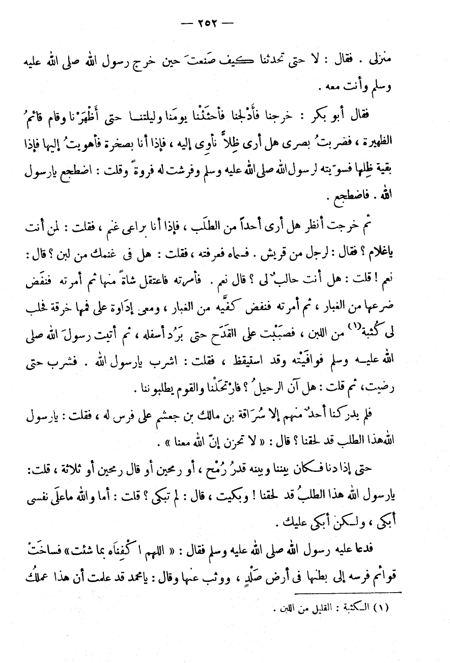 ثُمَّ خَرَجْتُ أَنْظُرُ هَلْ أَرَى أَحَدًا مِنَ الطَّلَبِ، فَإِذَا أَنَا بِرَاعِي غَنَمٍ، فَقُلْتُ: لِمَنْ أَنْتَ يَا غُلَامُ؟ فَقَالَ: لِرَجُلٍ مِنْ قُرَيْشٍ.