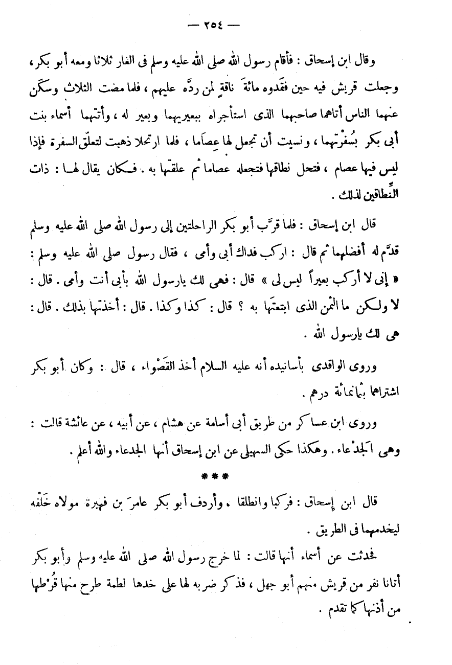 * * * قَالَ ابْنُ إِسْحَاقَ: فَرَكِبَا وَانْطَلَقَا، وَأَرْدَفَ أَبُو بَكْرٍ عَامِرَ بْنَ فُهَيْرَةَ مَوْلَاهُ خَلْفَهُ لِيَخْدِمَهُمَا فِي الطَّرِيقِ.