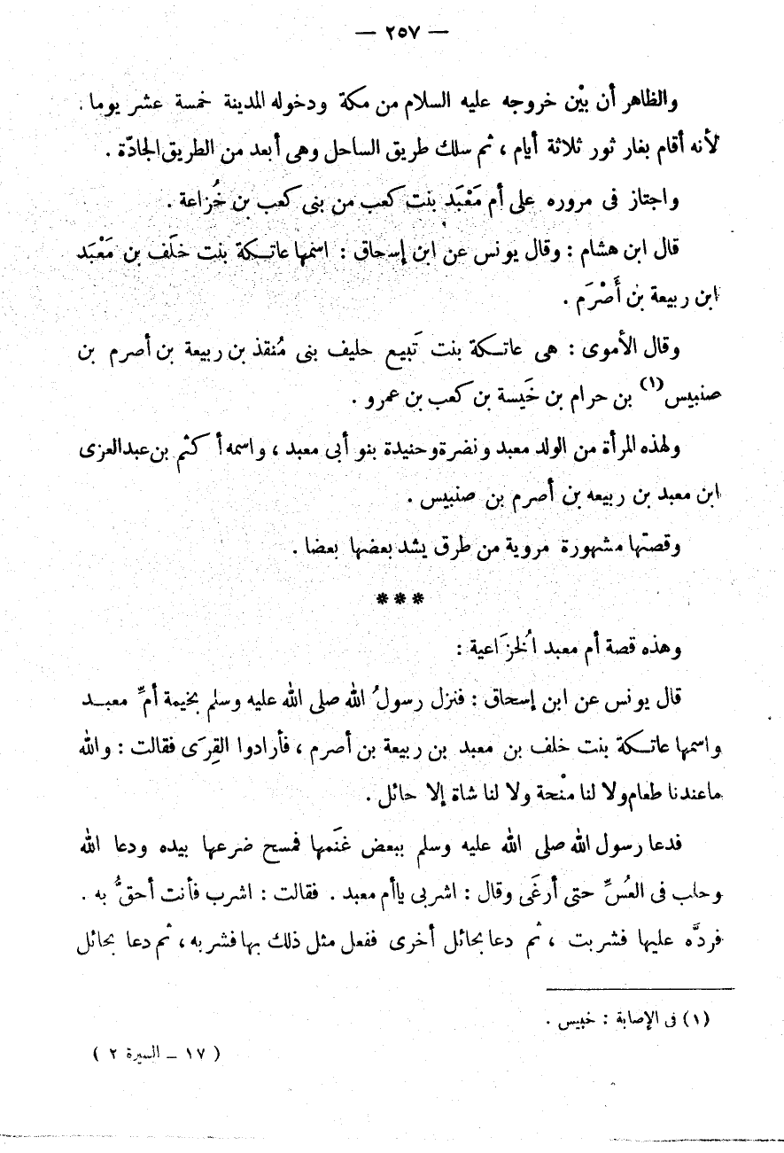 * * * وَهَذِهِ قِصَّةُ أُمِّ مَعْبَدٍ الْخُزَاعِيَّةِ: قَالَ يُونُسُ عَنِ ابْنِ إِسْحَاقَ: فَنَزَلَ رَسُولُ اللَّهِ صَلَّى اللَّهُ عَلَيْهِ وَسَلَّمَ بِخَيْمَةِ أُمِّ مَعْبَدٍ وَاسْمهَا عَاتِكَة بنت خلف بن معبد بْنِ رَبِيعَةَ بْنِ أَصْرَمَ، فَأَرَادُوا الْقِرَى فَقَالَتْ: وَاللَّهِ مَا عِنْدَنَا طَعَامٌ وَلَا لَنَا مِنْحَةٌ وَلَا لَنَا شَاةٌ إِلَّا حَائِلٌ.