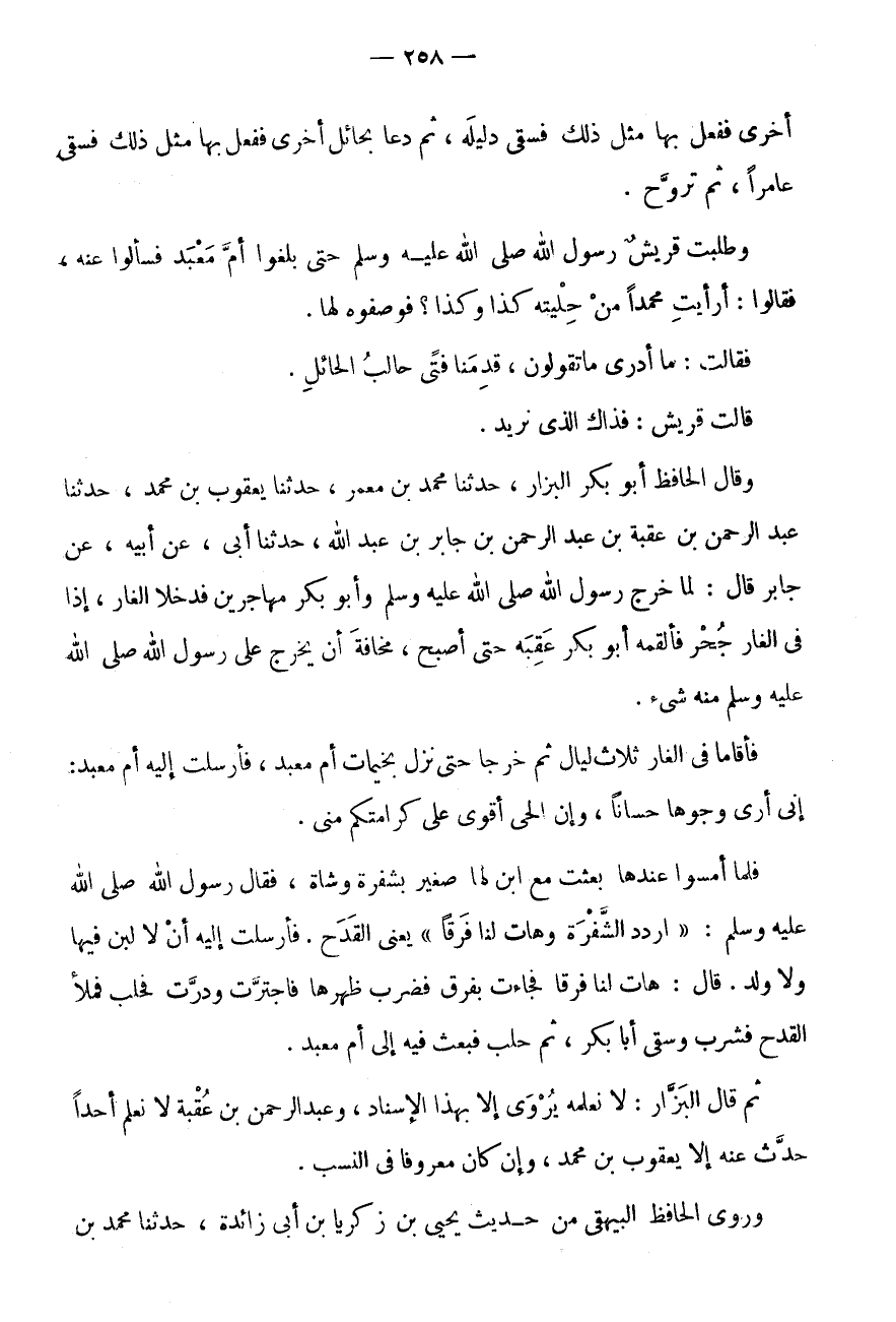 وَطَلَبَتْ قُرَيْشٍ رَسُولَ اللَّهِ صَلَّى اللَّهُ عَلَيْهِ وَسَلَّمَ حَتَّى بَلَغُوا أُمَّ مَعْبَدٍ فَسَأَلُوا عَنْهُ، فَقَالُوا: أَرَأَيْتِ مُحَمَّدًا مِنْ حِلْيَتِهِ كَذَا وَكَذَا؟ فَوَصَفُوهُ لَهَا.