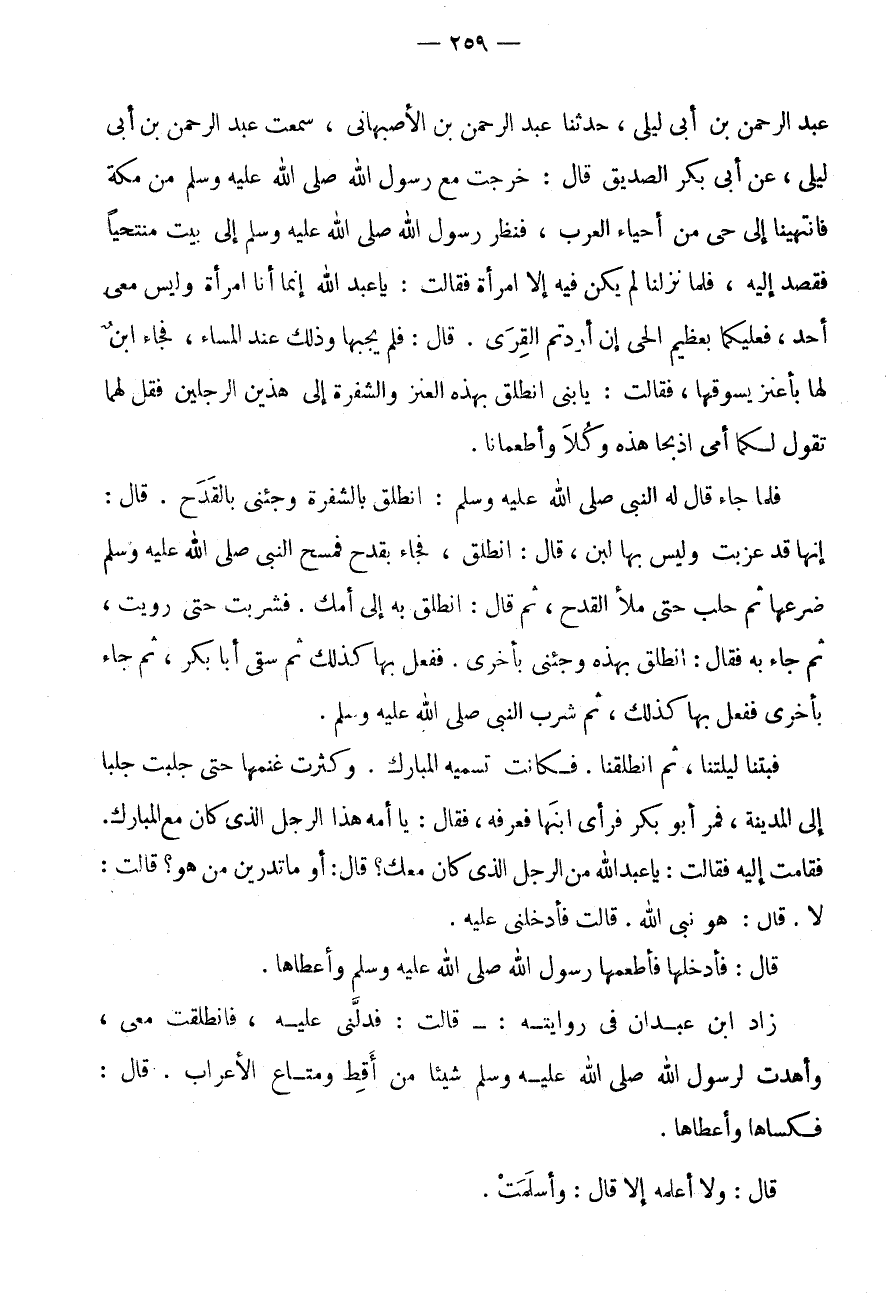 عبد الرَّحْمَن بن أَبى ليلى، حَدثنَا عبد الرَّحْمَن بن الْأَصْبَهَانِيِّ، سَمِعْتُ عَبْدَ الرَّحْمَنِ بْنَ أَبِي لَيْلَى، عَنْ أَبِي بَكْرٍ الصِّدِّيقِ قَالَ: خَرَجْتُ مَعَ رَسُولِ اللَّهِ صَلَّى اللَّهُ عَلَيْهِ وَسَلَّمَ من مَكَّةَ فَانْتَهَيْنَا إِلَى حَيٍّ مِنْ أَحْيَاءِ الْعَرَبِ، فَنَظَرَ رَسُولُ اللَّهِ صَلَّى اللَّهُ عَلَيْهِ وَسَلَّمَ إِلَى بَيْتٍ مُنْتَحِيًا فَقَصَدَ إِلَيْهِ، فَلَمَّا نَزَلْنَا لَمْ يَكُنْ فِيهِ إِلَّا امْرَأَةٌ فَقَالَتْ: يَا عَبْدَ اللَّهِ إِنَّمَا أَنَا امْرَأَةٌ وَلَيْسَ مَعِي أَحَدٌ، فَعَلَيْكُمَا بِعَظِيمِ الْحَيِّ إِنْ أَرَدْتُمُ الْقِرَى.