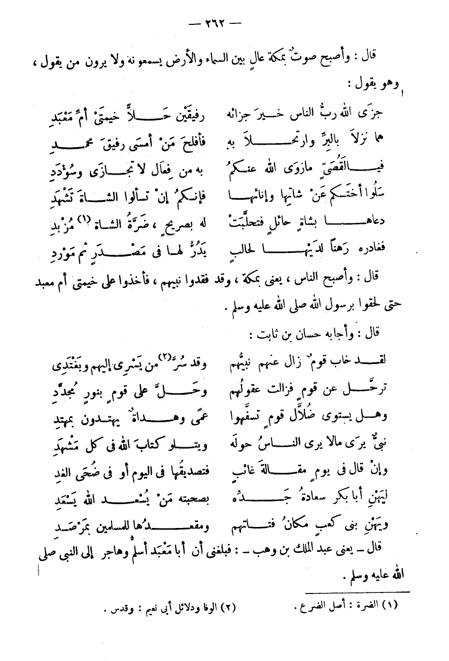 دَعَاهَا بِشَاةٍ حَائِلٍ فَتَحَلَّبَتْ * لَهُ بِصَرِيحٍ، ضَرَّةُ الشَّاةِ (1) مُزْبِدِ فَغَادَرَهُ رَهْنًا لَدَيْهَا لِحَالِبٍ * يَدُرُّ لَهَا فِي مَصْدَرٍ ثُمَّ مَوْرِدِ قَالَ: وَأَصْبَحَ النَّاسُ، يَعْنِي بِمَكَّةَ، وَقَدْ فَقَدُوا نَبِيَّهُمْ، فَأَخَذُوا عَلَى خَيْمَتَيْ أُمِّ مَعْبَدٍ حَتَّى لَحِقُوا بِرَسُولِ اللَّهِ صَلَّى اللَّهُ عَلَيْهِ وَسَلَّمَ.