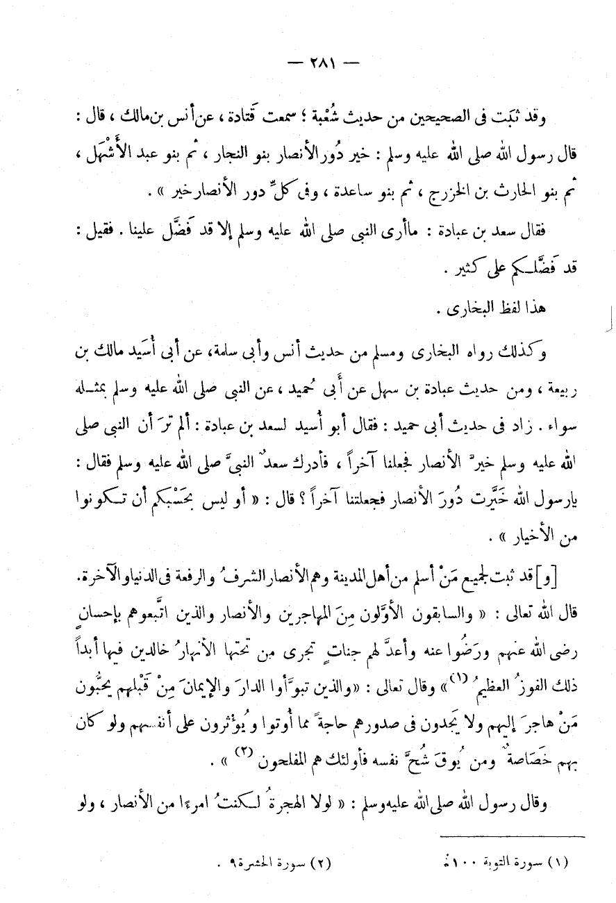 [و] قَدْ ثَبَتَ لِجَمِيعِ مَنْ أَسْلَمَ مِنْ أَهْلِ الْمَدِينَةِ وَهُمُ الْأَنْصَارُ الشَّرَفُ وَالرِّفْعَةُ فِي الدُّنْيَا وَالْآخِرَةِ.