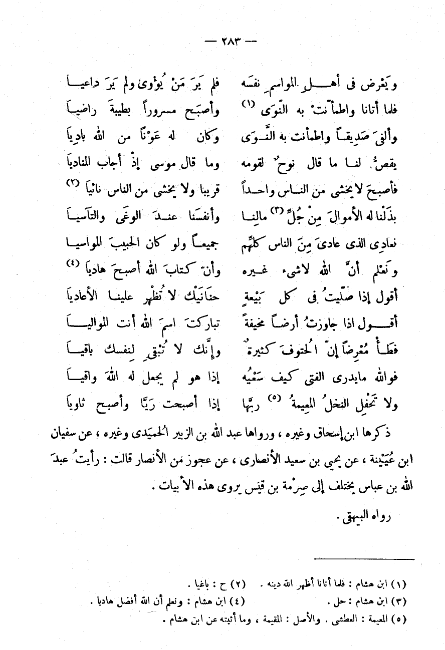 فَأَصْبَحَ لَا يَخْشَى مِنَ النَّاسِ وَاحِدًا * قَرِيبًا وَلَا يَخْشَى مِنَ النَّاسِ نَائِيَا (2) بَذَلْنَا لَهُ الْأَمْوَالَ من جلّ (3) مَالِنَا * وَأَنْفُسَنَا عِنْدَ الْوَغَى وَالتَّآسِيَا نُعَادِي الَّذِي عَادَى مِنَ النَّاسِ كُلِّهِمْ * جَمِيعًا وَلَوْ كَانَ الحبيب المواسيا ونعلم أَن الله لَا شئ غَيْرُهُ * وَأَنَّ كِتَابَ اللَّهِ أَصْبَحَ هَادِيَا (4) أَقُولُ إِذَا صَلَّيْتُ فِي كُلِّ بِيعَةٍ * حَنَانَيْكَ لَا تُظْهِرْ عَلَيْنَا الُأَعَادِيَا أَقُولُ إِذَا جَاوَزْتُ أَرْضًا مُخِيفَةً * تَبَارَكْتَ إِسْمَ اللَّهِ أَنْتَ الْمُوَالِيَا فَطَأْ مُعْرِضًا إِنَّ الْحُتُوفَ كَثِيرَةٌ * وَإِنَّكَ لَا تُبْقِي لنَفسك بَاقِيا فو الله مَا يَدْرِي الْفَتَى كَيْفَ سَعْيُهُ * إِذَا هُوَ لَمْ يَجْعَلْ لَهُ اللَّهَ وَاقِيَا وَلَا تَحْفِلُ النَّخْلُ الْمُعِيمَةُ (5) رَبَّهَا * إِذَا أَصْبَحَتْ رِيًّا وَأَصْبَحَ ثَاوِيَا ذَكَرَهَا ابْنُ إِسْحَاقَ وَغَيْرُهُ، وَرَوَاهَا عَبْدُ اللَّهِ بْنُ الزُّبَيْرِ الْحُمَيْدٍيُّ وَغَيْرُهُ، عَنْ سُفْيَانَ ابْن عُيَيْنَةَ، عَنْ يَحْيَى بْنِ سَعِيدٍ الْأَنْصَارِيِّ، عَنْ عَجُوزٍ مِنَ الْأَنْصَارِ قَالَتْ: رَأَيْتُ عَبْدَ اللَّهِ بْنَ عَبَّاسٍ يَخْتَلِفُ إِلَى صِرْمَةَ بْنِ قَيْسٍ يرْوى هَذِه الابيات.