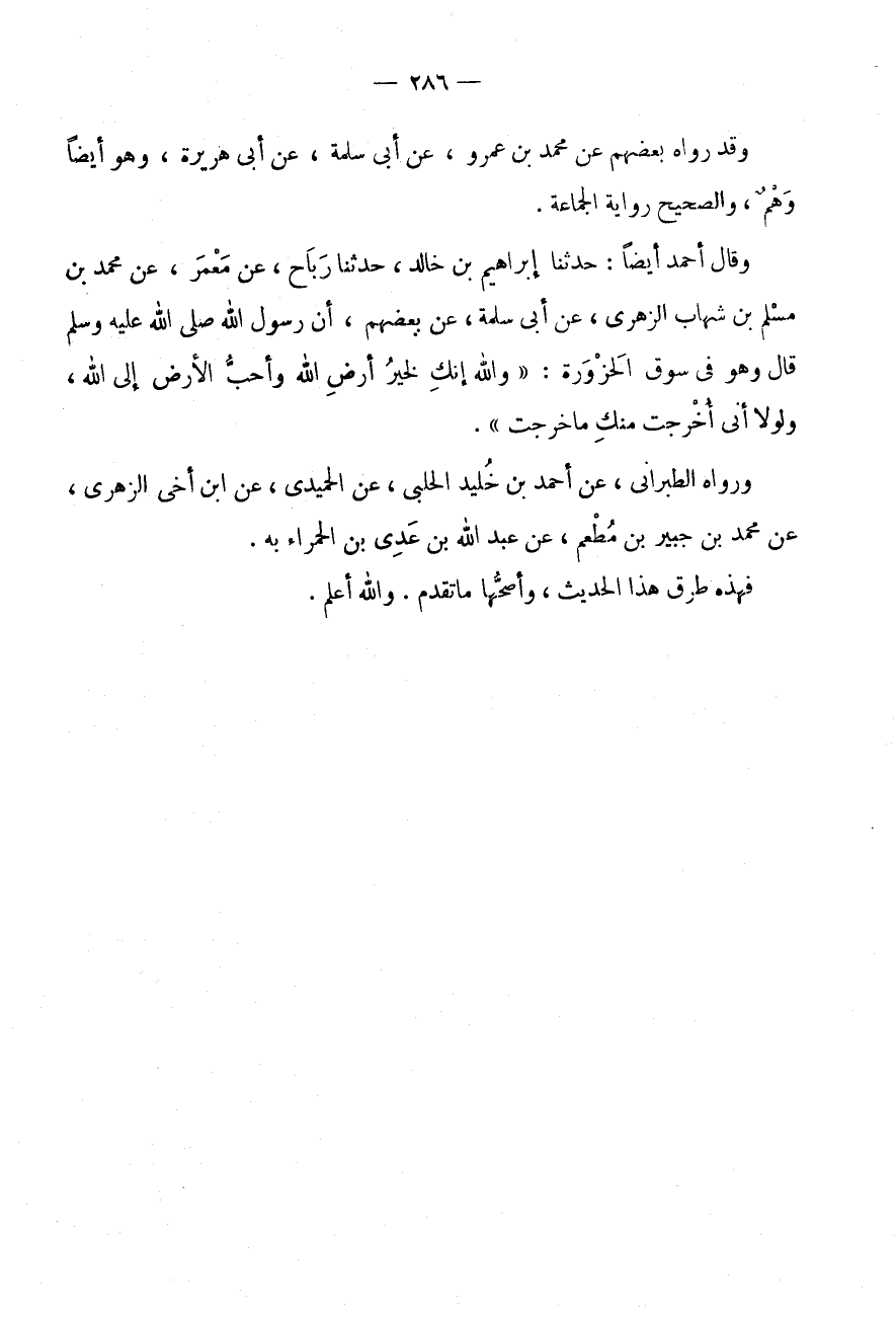 وَقَالَ أَحْمَدُ أَيْضا: حَدثنَا إِبْرَاهِيم بن خَالِد، حَدثنَا رَبَاحٌ، عَنْ مَعْمَرٍ، عَنْ مُحَمَّدِ بْنِ مُسْلِمِ بْنِ شِهَابٍ الزُّهْرِيِّ، عَنْ أَبِي سَلَمَةَ، عَنْ بَعْضِهِمْ، أَنَّ رَسُولَ اللَّهِ صَلَّى اللَّهُ عَلَيْهِ وَسَلَّمَ قَالَ وَهُوَ فِي سُوقِ الْحَزْوَرَةِ: " وَاللَّهِ إِنَّكِ لَخَيْرُ أَرْضِ اللَّهِ وَأَحَبُّ الْأَرْضِ إِلَى اللَّهِ، وَلَوْلَا أَنِّي أُخْرِجْتُ مِنْكِ مَا خَرَجْتُ ".