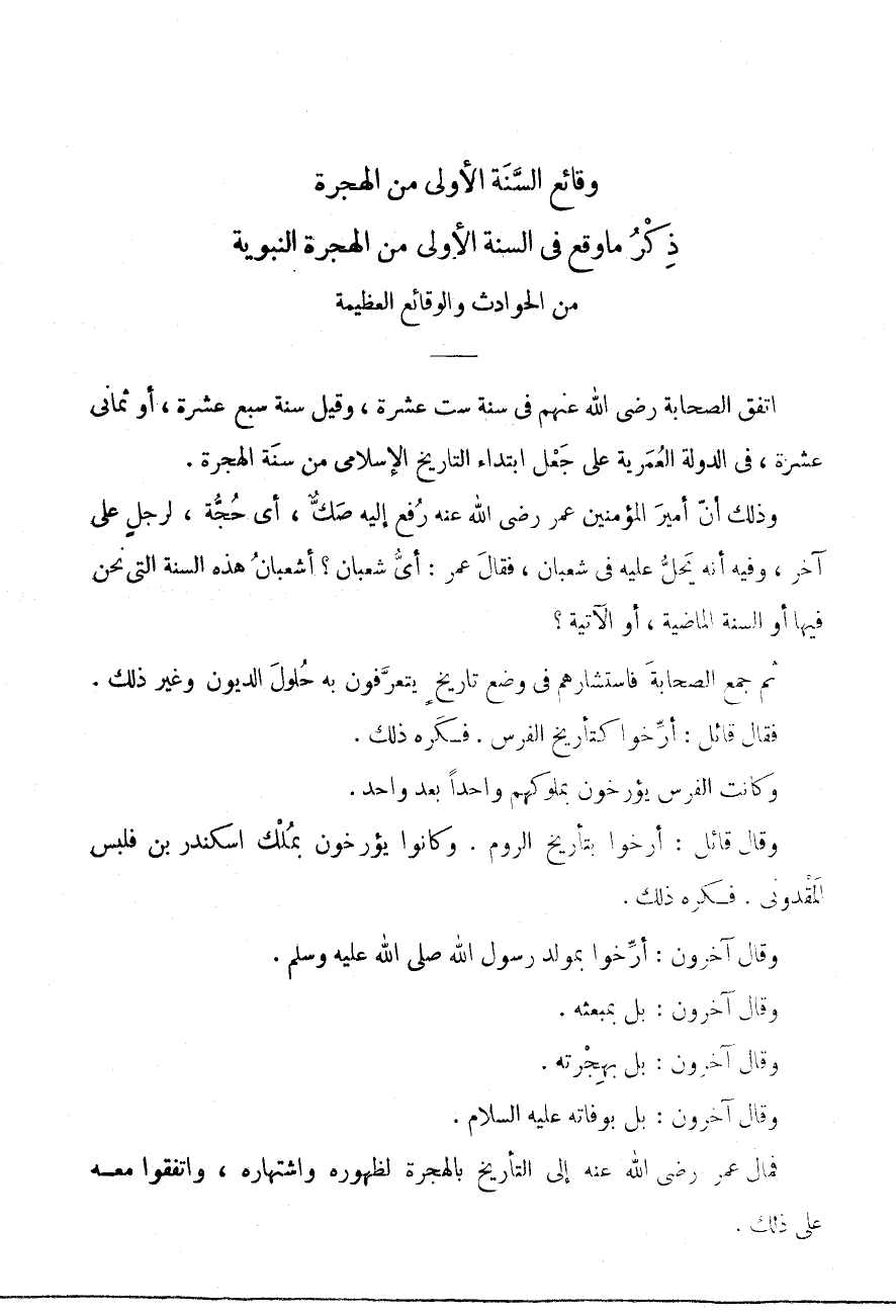 وقائع السّنة الاولى من الْهِجْرَة ذِكْرُ مَا وَقَعَ فِي السَّنَةِ الْأُولَى مِنَ الْهِجْرَة النَّبَوِيَّة من الْحَوَادِث والوقائع الْعَظِيمَة اتَّفَقَ الصَّحَابَةُ رَضِيَ اللَّهُ عَنْهُمْ فِي سَنَةِ سِتَّ عَشْرَةَ، وَقِيلَ سَنَةَ سَبْعَ عَشْرَةَ، أَوْ ثَمَانِيَ عَشْرَةَ، فِي الدَّوْلَةِ الْعُمَرِيَّةِ عَلَى جَعْلِ ابْتِدَاءِ التَّارِيخِ الْإِسْلَامِيِّ مِنْ سَنَةِ الْهِجْرَةِ.