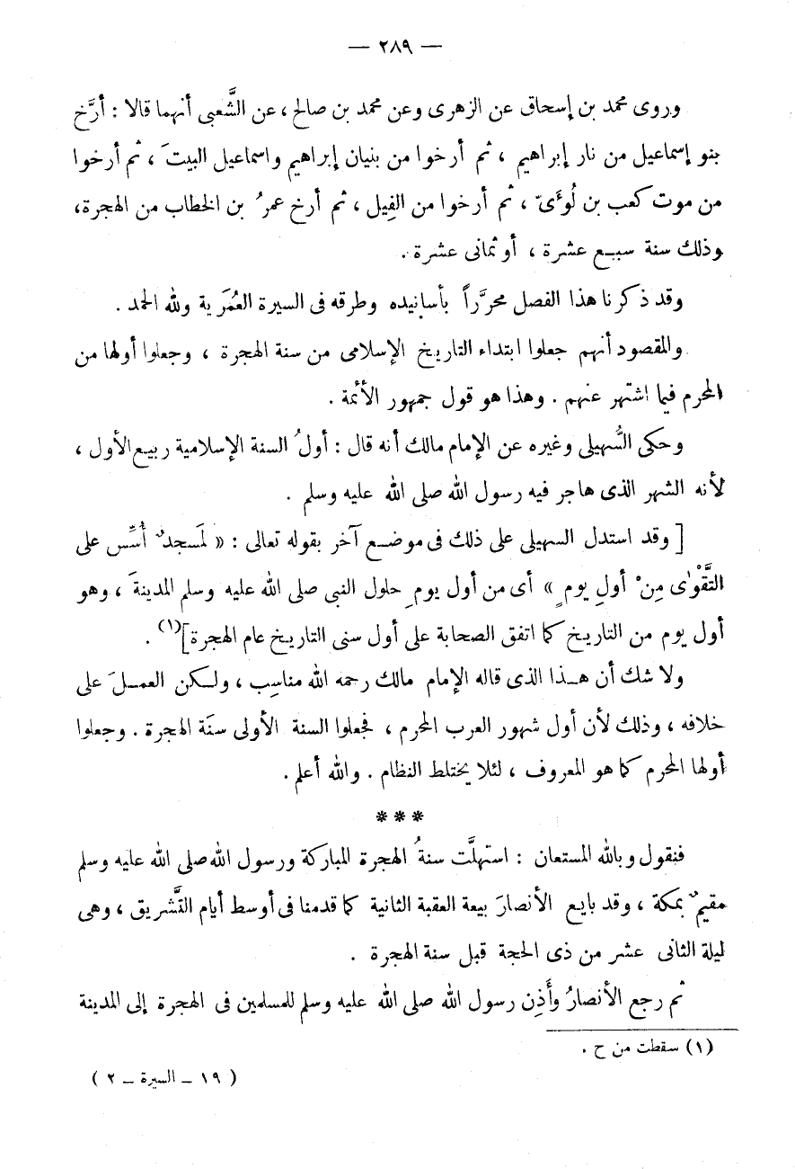 [وَقَدِ اسْتَدَلَّ السُّهَيْلِيُّ عَلَى ذَلِكَ فِي مَوْضِعٍ آخَرَ بِقَوْلِهِ تَعَالَى: " لَمَسْجِدٌ أُسِّسَ عَلَى التَّقْوَى مِنْ أَوَّلِ يَوْمٍ " أَيْ مِنْ أَوَّلِ يَوْمِ حُلُولِ النَّبِيِّ صَلَّى اللَّهُ عَلَيْهِ وَسَلَّمَ الْمَدِينَةَ، وَهُوَ أَوَّلُ يَوْمٍ مِنَ التَّارِيخِ كَمَا اتَّفَقَ الصَّحَابَةُ عَلَى أَوَّلِ سِنِيِّ التَّارِيخِ عَامَ الْهِجْرَةِ] (1) .