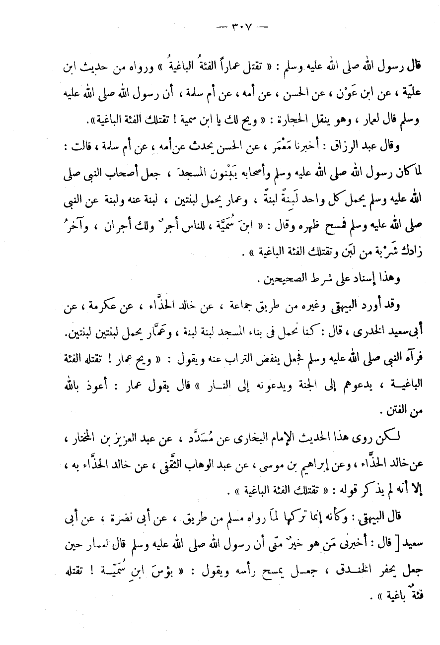 قَالَ رَسُولُ اللَّهِ صَلَّى اللَّهُ عَلَيْهِ وَسَلَّمَ: " تَقْتُلُ عَمَّارًا الْفِئَةُ الْبَاغِيَةُ " وَرَوَاهُ مِنْ حَدِيثِ ابْنِ عُلَيَّةَ، عَنِ ابْنِ عَوْنٍ، عَنِ الْحَسَنِ، عَنْ أُمِّهِ، عَنْ أُمِّ سَلَمَةَ، أَنَّ رَسُولَ اللَّهِ صَلَّى اللَّهُ عَلَيْهِ وَسَلَّمَ قَالَ لعمَّار، وَهُوَ يَنْقُلُ الْحِجَارَةَ: " وَيْحٌ لَكَ يَا ابْنَ سُمَيَّةَ! تَقْتُلُكَ الْفِئَةُ الْبَاغِيَةُ ".