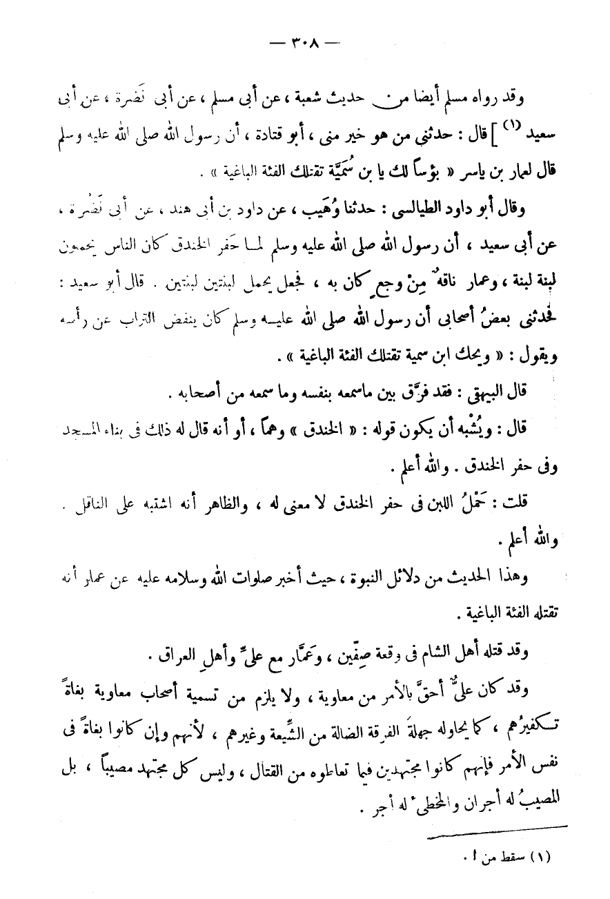 وَقَدْ رَوَاهُ مُسْلِمٌ أَيْضًا مِنْ حَدِيثِ شُعْبَةَ، عَن أَبى مُسلم، عَنْ أَبِي نَضْرَةَ، عَنْ أَبِي سَعِيدٍ (1) ] قَالَ: حَدَّثَنِي مَنْ هُوَ خَيْرٌ مِنِّي، أَبُو قَتَادَةَ، أَنَّ رَسُولَ اللَّهِ صَلَّى اللَّهُ عَلَيْهِ وَسَلَّمَ قَالَ لِعَمَّارِ بْنِ يَاسِرٍ " بُؤْسًا لَكَ يَا بن سُمَيَّةَ تَقْتُلُكَ الْفِئَةُ الْبَاغِيَةُ ".