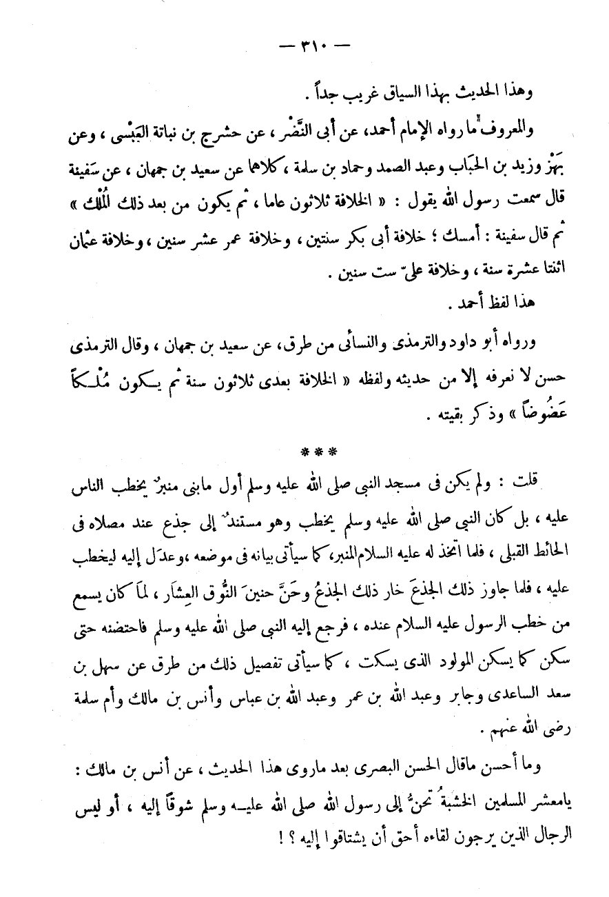 وَرَوَاهُ أَبُو دَاوُدَ وَالتِّرْمِذِيُّ وَالنَّسَائِيُّ مِنْ طُرُقٍ، عَنْ سَعِيدِ بْنِ جُمْهَانَ، وَقَالَ التِّرْمِذِيُّ حَسَنٌ لَا نَعْرِفُهُ إِلَّا مِنْ حَدِيثِهِ وَلَفَظُهُ " الْخِلَافَةُ بَعْدِي ثَلَاثُونَ سَنَةً ثُمَّ يَكُونُ مُلْكًا عَضُوضًا " وَذَكَرَ بَقِيَّتَهُ.