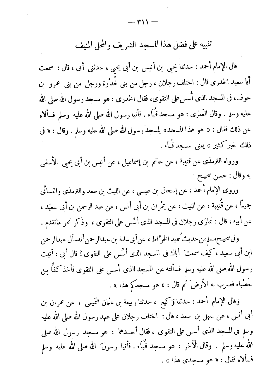 تَنْبِيهٌ عَلَى فَضْلِ هَذَا الْمَسْجِدِ الشَّرِيفِ وَالْمَحَلِّ المنيف قَالَ الامام أَحْمد: حَدثنَا يحيى بن أُنَيْسِ بْنِ أَبِي يَحْيَى، حَدَّثَنِي أَبِي، قَالَ: سَمِعْتُ أَبَا سَعِيدٍ الْخُدْرِيَّ قَالَ: اخْتَلَفَ رَجُلَانِ، رَجُلٌ مِنْ بَنِي خُدْرَةَ وَرَجُلٌ مِنْ بَنِي عَمْرِو بْنِ عَوْفٍ، فِي الْمَسْجِدِ الَّذِي أُسِّسَ عَلَى التَّقْوَى، فَقَالَ الْخِدْرِي: هُوَ مَسْجِدِ رَسُولِ اللَّهِ صَلَّى اللَّهُ عَلَيْهِ وَسَلَّمَ.