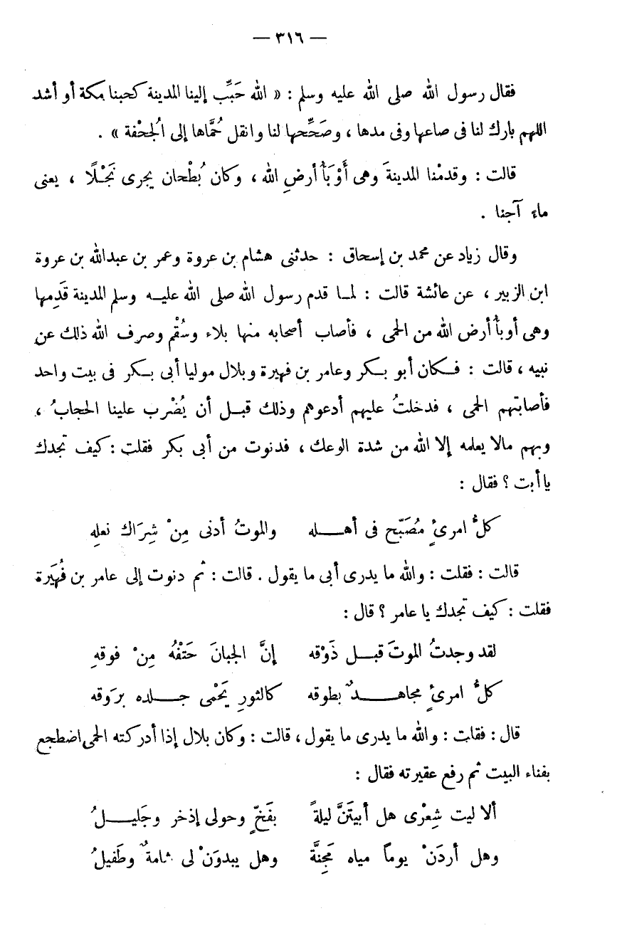 قَالَتْ: ثُمَّ دَنَوْتُ إِلَى عَامِرِ بْنِ فُهَيْرَةَ فَقُلْتُ: كَيْفَ تَجِدُكَ يَا عَامِرُ؟ قَالَ: لَقَدْ وَجَدْتُ الْمَوْتَ قَبْلَ ذَوْقِهِ * إِنَّ الْجَبَانَ حَتْفُهُ مِنْ فَوْقِهِ كُلُّ امْرِئٍ مُجَاهِدٌ بِطَوْقِهِ * كَالثَّوْرِ يَحْمِي جلده بروقه قَالَ: فَقلت: وَالله مَا يدرى مَا يَقُولُ، قَالَتْ: وَكَانَ بِلَالٌ إِذَا أَدْرَكَتْهُ الْحُمَّى اضْطَجَعَ بِفِنَاءِ الْبَيْتِ ثُمَّ رَفَعَ عَقِيرَتَهُ فَقَالَ: أَلَا لَيْتَ شِعْرِي هَلْ أَبِيتَنَّ لَيْلَةً * بِفَخٍّ وَحَوْلِي إِذْخِرٌ وَجَلِيلُ وَهَلْ أَرِدَنْ يَوْمًا مِيَاهَ مَجَنَّةٍ * وَهَلْ يَبْدُوَنْ لِي شَامَةٌ وَطَفِيلُ