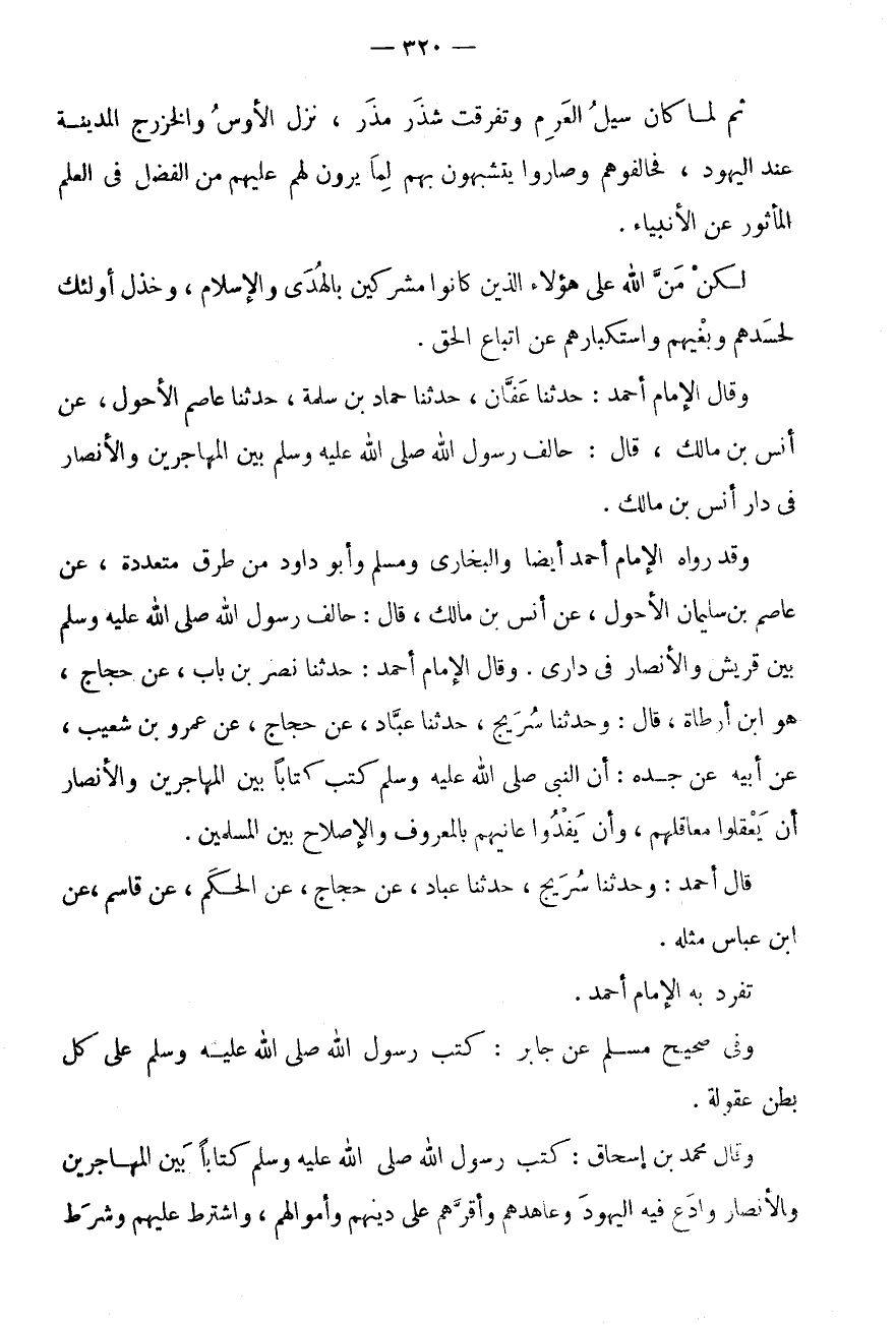 وَقَالَ مُحَمَّدُ بْنُ إِسْحَاق: كَتَبَ رَسُولُ اللَّهِ صَلَّى اللَّهُ عَلَيْهِ وَسَلَّمَ كِتَابًا بَيْنَ الْمُهَاجِرِينَ وَالْأَنْصَارِ وَادَعَ فِيهِ الْيَهُودَ وَعَاهَدَهُمْ وَأَقَرَّهُمْ عَلَى دِينِهِمْ وَأَمْوَالِهِمْ، وَاشْتَرَطَ عَلَيْهِمْ وَشرط