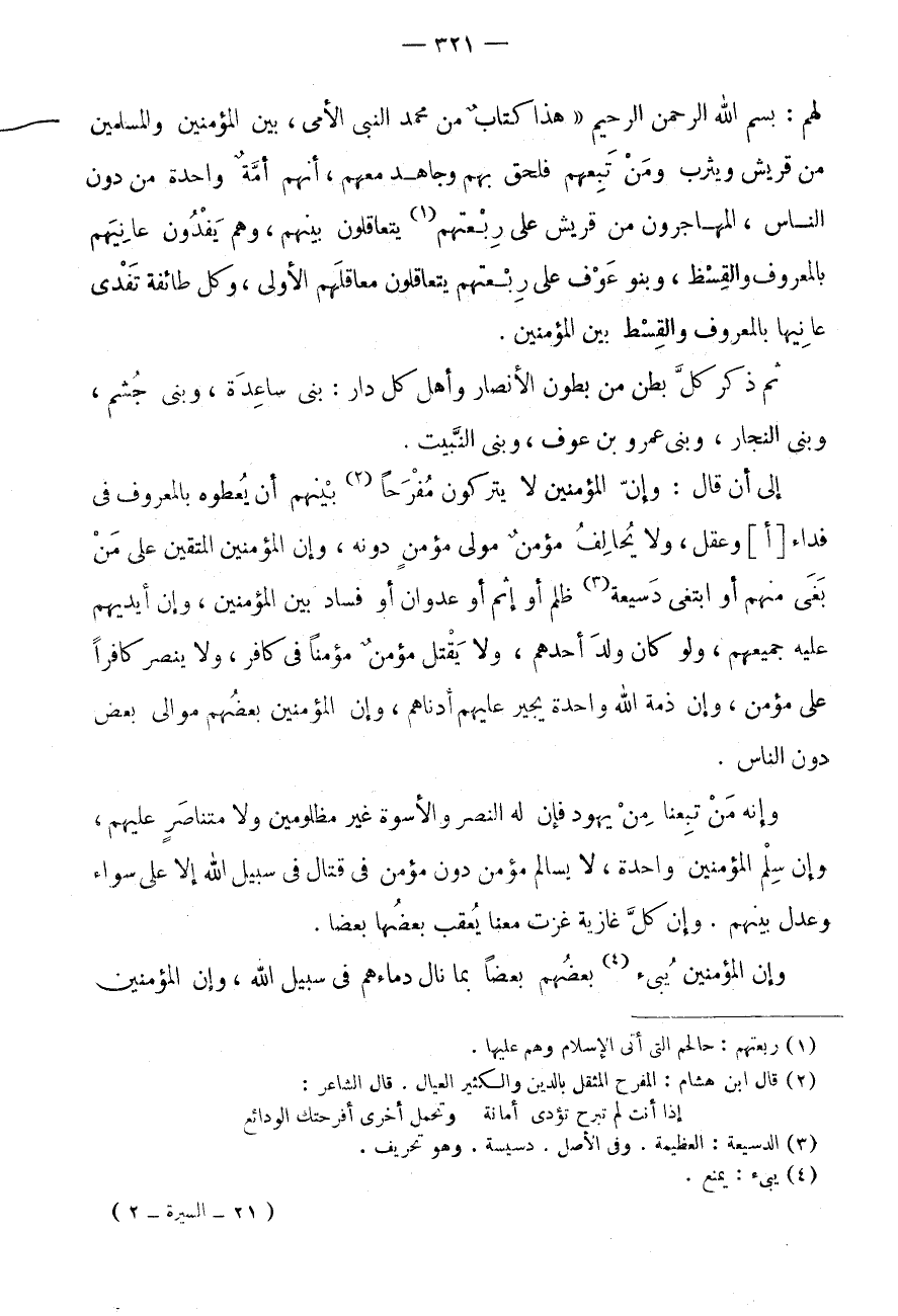لَهُمْ: بِسْمِ اللَّهِ الرَّحْمَنِ الرَّحِيمِ " هَذَا كِتَابٌ مِنْ مُحَمَّد النَّبِي الامي، بَيْنَ الْمُؤْمِنِينَ وَالْمُسْلِمِينَ مِنْ قُرَيْشٍ وَيَثْرِبَ وَمَنْ تَبِعَهُمْ فَلَحِقَ بِهِمْ وَجَاهَدَ مَعَهُمْ، إِنَّهُمْ أُمَّةٌ وَاحِدَةٌ مِنْ دُونِ النَّاسِ، الْمُهَاجِرُونَ مِنْ قُرَيْشٍ عَلَى رِبْعَتِهِمْ (1) يَتَعَاقَلُونَ بَيْنَهُمْ، وَهُمْ يَفْدُونَ عَانِيَهُمْ بِالْمَعْرُوفِ والقسظ، وَبَنُو عَوْفٍ عَلَى رِبْعَتِهِمْ يَتَعَاقَلُونَ مَعَاقِلَهُمُ الْأَوْلَى، وَكُلُّ طَائِفَةٍ تَفْدِي عَانِيَهَا بِالْمَعْرُوفِ وَالْقِسْطِ بَيْنَ الْمُؤْمِنِينَ.