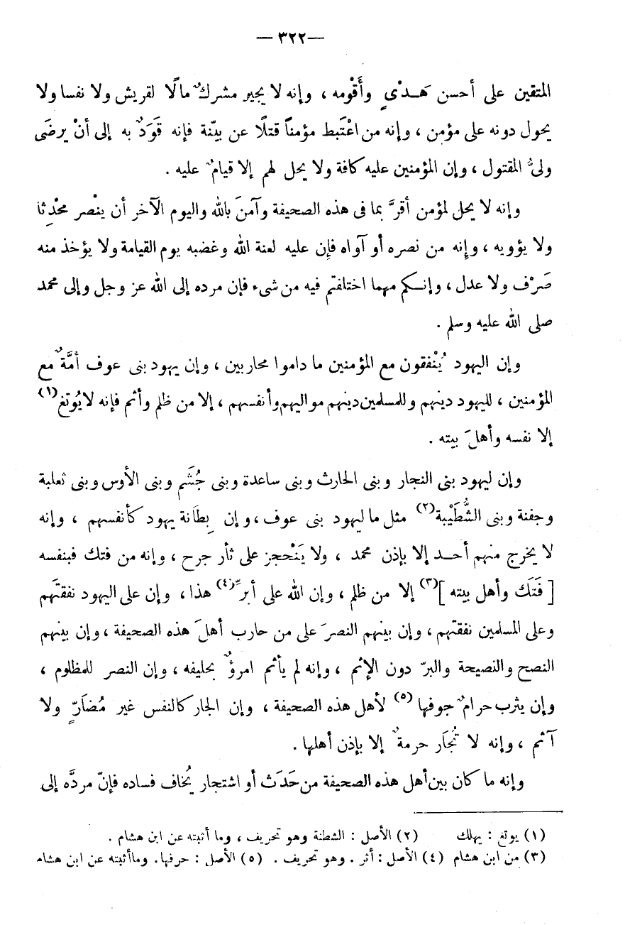 وَإِنَّ لِيَهُودِ بَنِي النَّجَّارِ وَبَنِي الْحَارِثِ وَبَنِي سَاعِدَةَ وَبَنِي جُشَمَ وَبَنِي الْأَوْسِ وَبَنِي ثَعْلَبَةَ وَجَفْنَةَ وَبَنِي الشُّطَيْبَةِ (2) مِثْلَ مَا لِيَهُودِ بَنِي عَوْفٍ، وَإِنَّ بِطَانَةَ يَهُودَ كَأَنْفُسِهِمْ، وَإِنَّهُ لَا يَخْرُجُ مِنْهُمْ أَحَدٌ إِلَّا بِإِذن مُحَمَّد، وَلَا يَنْحَجِزُ عَلَى ثَأْرِ جُرْحٍ، وَإِنَّهُ مَنْ فَتَكَ فَبِنَفْسِهِ [فَتَكَ وَأَهْلِ بَيْتِهِ] (3) إِلَّا مَنْ ظُلِمَ، وَإِنَّ اللَّهَ عَلَى أَبَرِّ (4) هَذَا، وَإِنَّ عَلَى الْيَهُودِ نَفَقَتَهُمْ وَعَلَى الْمُسْلِمِينَ نَفَقَتَهُمْ، وَإِنَّ بَيْنَهُمُ النَّصْرَ عَلَى مَنْ حَارَبَ أَهْلَ هَذِهِ الصَّحِيفَةِ، وَإِنَّ بَيْنَهُمُ النُّصْحَ وَالنَّصِيحَةَ وَالْبِرَّ دُونَ الْإِثْمِ، وَإِنَّهُ لَمْ يَأْثَمِ امْرُؤٌ بِحَلِيفِهِ، وَإِنَّ النَّصْرَ لِلْمَظْلُومِ، وَإِنَّ يَثْرِبَ حَرَامٌ جَوْفُهَا (5) لِأَهْلِ هَذِهِ الصَّحِيفَةِ، وَإِنَّ الْجَارَ كَالنَّفْسِ غَيْرَ مُضَارٍّ وَلَا آثِمٍ، وَإِنَّهُ لَا تُجَارُ حُرْمَةٌ إِلَّا بِإِذْنِ أَهْلِهَا.