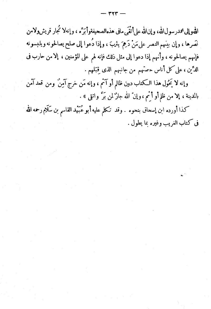 الله وَإِلَى مُحَمَّد رَسُول الله، وَإِنَّ اللَّهَ عَلَى أَتْقَى مَا فِي هَذِهِ الصَّحِيفَةِ وَأَبَرِّهِ، وَإِنَّهُ لَا تُجَارُ قُرَيْشٌ وَلَا مَنْ نَصَرَهَا، وَإِنَّ بَيْنَهُمُ النَّصْرَ عَلَى مَنْ دَهَمَ يَثْرِبَ، وَإِذَا دَعَوْا إِلَى صُلْحٍ يُصَالِحُونَهُ وَيَلْبَسُونَهُ