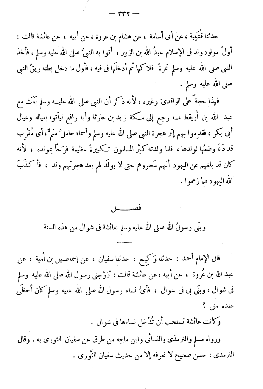 فَصْلٌ وَبَنَى رَسُولُ اللَّهِ صَلَّى اللَّهُ عَلَيْهِ وَسَلَّمَ بِعَائِشَةَ فِي شَوَّالٍ مِنْ هَذِهِ السَّنَةِ قَالَ الْإِمَامُ أَحْمَدُ: حَدَّثَنَا وَكِيعٌ، حَدَّثَنَا سُفْيَانُ، عَنِ إِسْمَاعِيلَ بْنِ أُمَيَّةَ، عَنْ عَبْدِ اللَّهِ بْنِ عُرْوَةَ، عَنْ أَبِيهِ، عَنْ عَائِشَةَ قَالَتْ: تَزَوَّجَنِي رَسُولُ اللَّهِ صَلَّى اللَّهُ عَلَيْهِ وَسَلَّمَ فِي شَوَّالٍ، وَبَنَى بِي فِي شَوَّالٍ، فَأَيُّ نِسَاءِ رَسُولَ اللَّهِ صَلَّى اللَّهُ عَلَيْهِ وَسَلَّمَ كَانَ أَحْظَى عِنْدَهُ مِنِّي؟ وَكَانَتْ عَائِشَةُ تَسْتَحِبُّ أَنْ تُدْخِلَ نِسَاءَهَا فِي شَوَّالٍ.