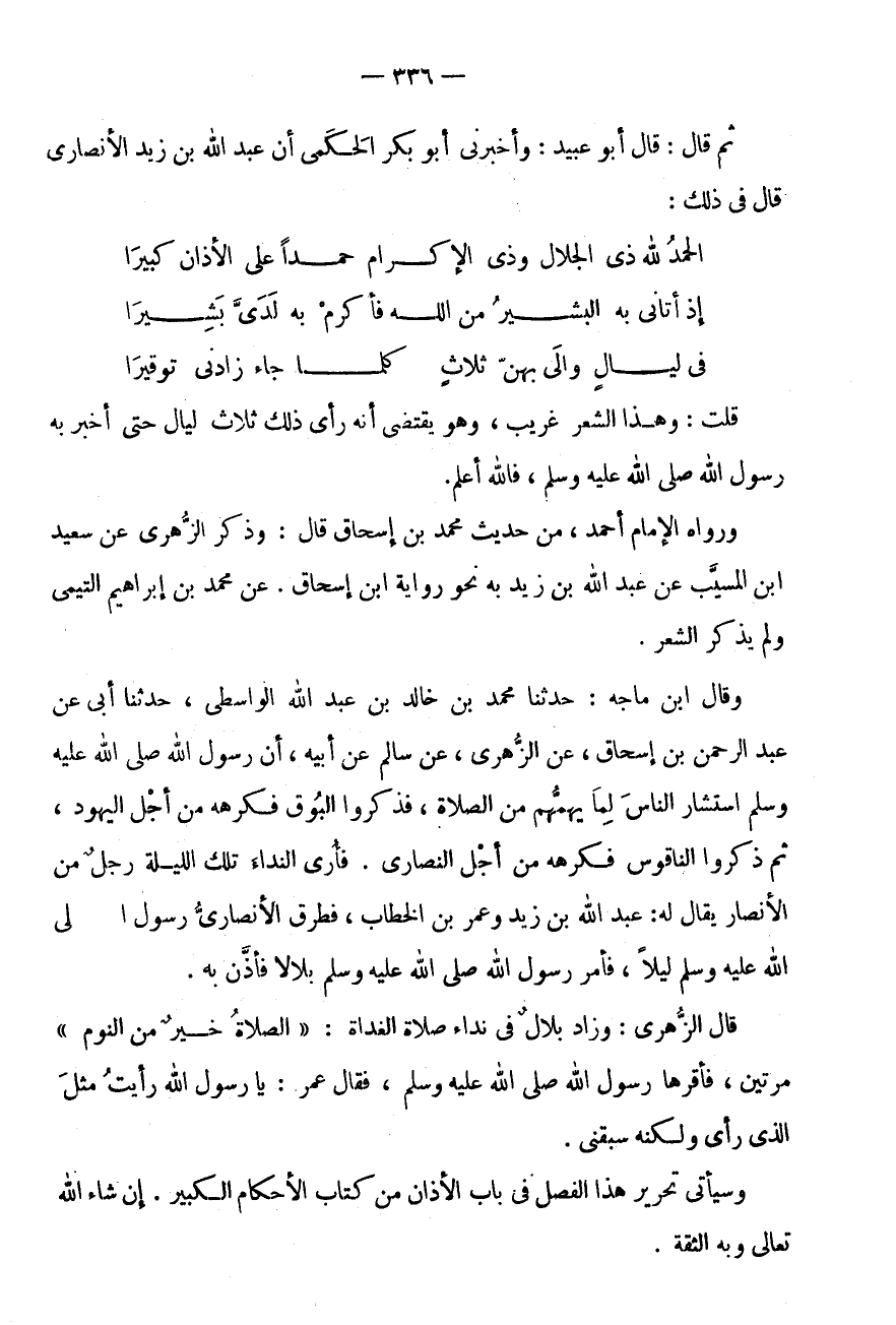 فَأُرِيَ النِّدَاءَ تِلْكَ اللَّيْلَةَ رَجُلٌ مِنَ الْأَنْصَارِ يُقَالُ لَهُ: عَبْدُ اللَّهِ بْنُ زَيْدٍ وَعُمَرُ بْنُ الْخَطَّابِ، فَطَرَقَ الْأَنْصَارِيُّ رَسُولَ اللَّهِ صَلَّى اللَّهُ عَلَيْهِ وَسَلَّمَ لَيْلًا، فَأَمَرَ رَسُولُ اللَّهِ صَلَّى اللَّهُ عَلَيْهِ وَسَلَّمَ بِلَالًا فَأَذَّنَ بِهِ.