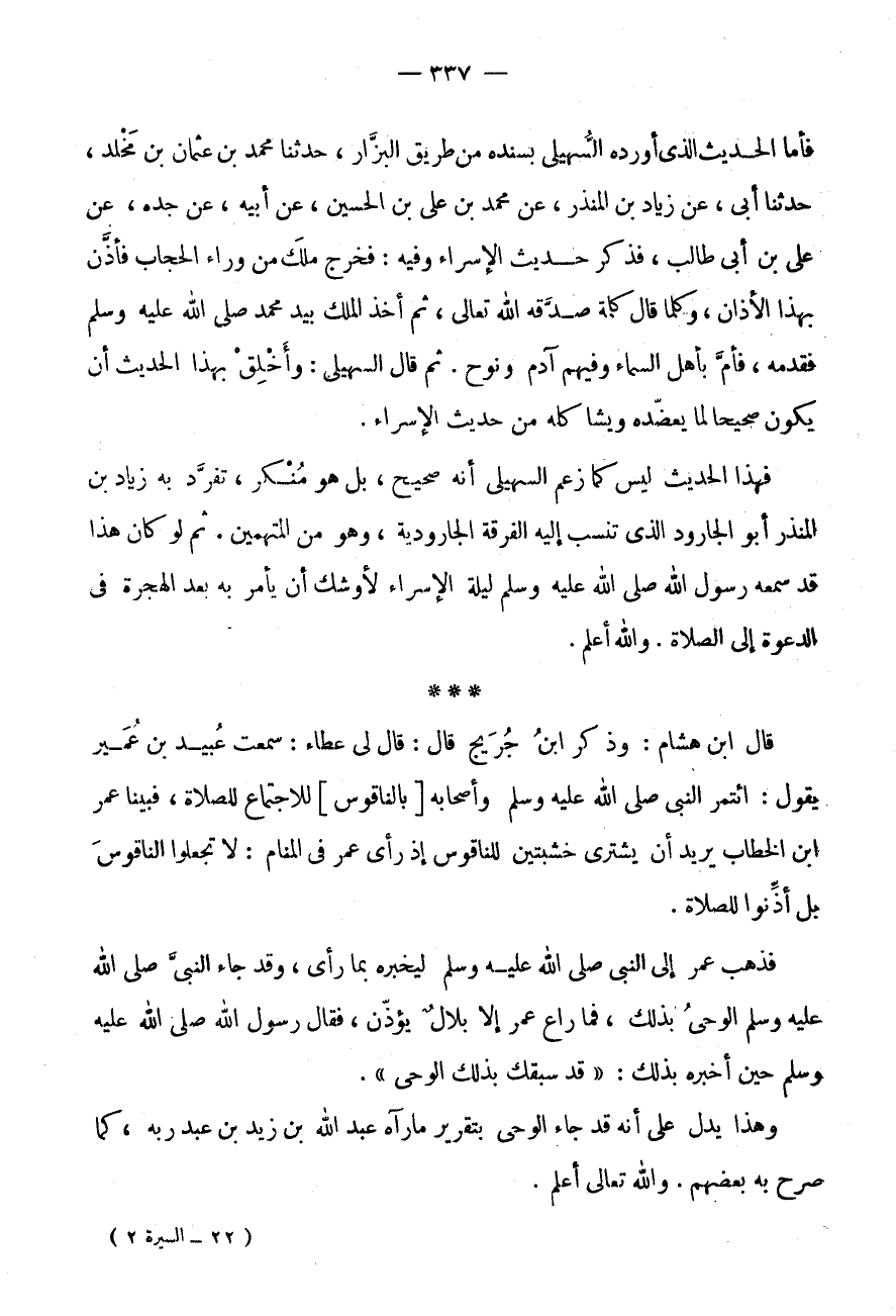 * * * قَالَ ابْنُ هِشَامٍ: وَذَكَرَ ابْنُ جُرَيْجٍ قَالَ: قَالَ لِي عَطَاءٌ: سَمِعْتُ عُبَيْدَ بْنَ عُمَيْرٍ يَقُولُ: ائْتَمَرَ النَّبِيُّ صَلَّى اللَّهُ عَلَيْهِ وَسَلَّمَ وَأَصْحَابُهُ [بِالنَّاقُوسِ] لِلِاجْتِمَاعِ لِلصَّلَاةِ، فَبَيْنَا عمر ابْن الْخَطَّابِ يُرِيدُ أَنْ يَشْتَرِيَ خَشَبَتَيْنِ لِلنَّاقُوسِ إِذْ رَأَى عُمَرُ فِي الْمَنَامِ: لَا تَجْعَلُوا النَّاقُوسَ بَلْ أَذِّنُوا لِلصَّلَاةِ.
