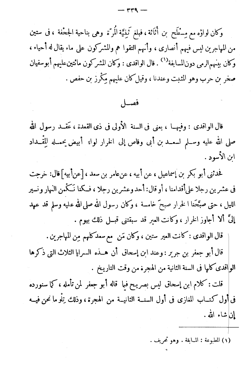 قَالَ أَبُو جَعْفَرِ بْنُ جَرِيرٍ: وَعِنْدَ ابْنِ إِسْحَاقَ أَنَّ هَذِهِ السَّرَايَا الثَّلَاثَ الَّتِي ذَكَرَهَا الْوَاقِدِيُّ كُلَّهَا فِي السَّنَةِ الثَّانِيَةِ مِنَ الْهِجْرَةِ مِنْ وَقْتِ التَّارِيخِ.