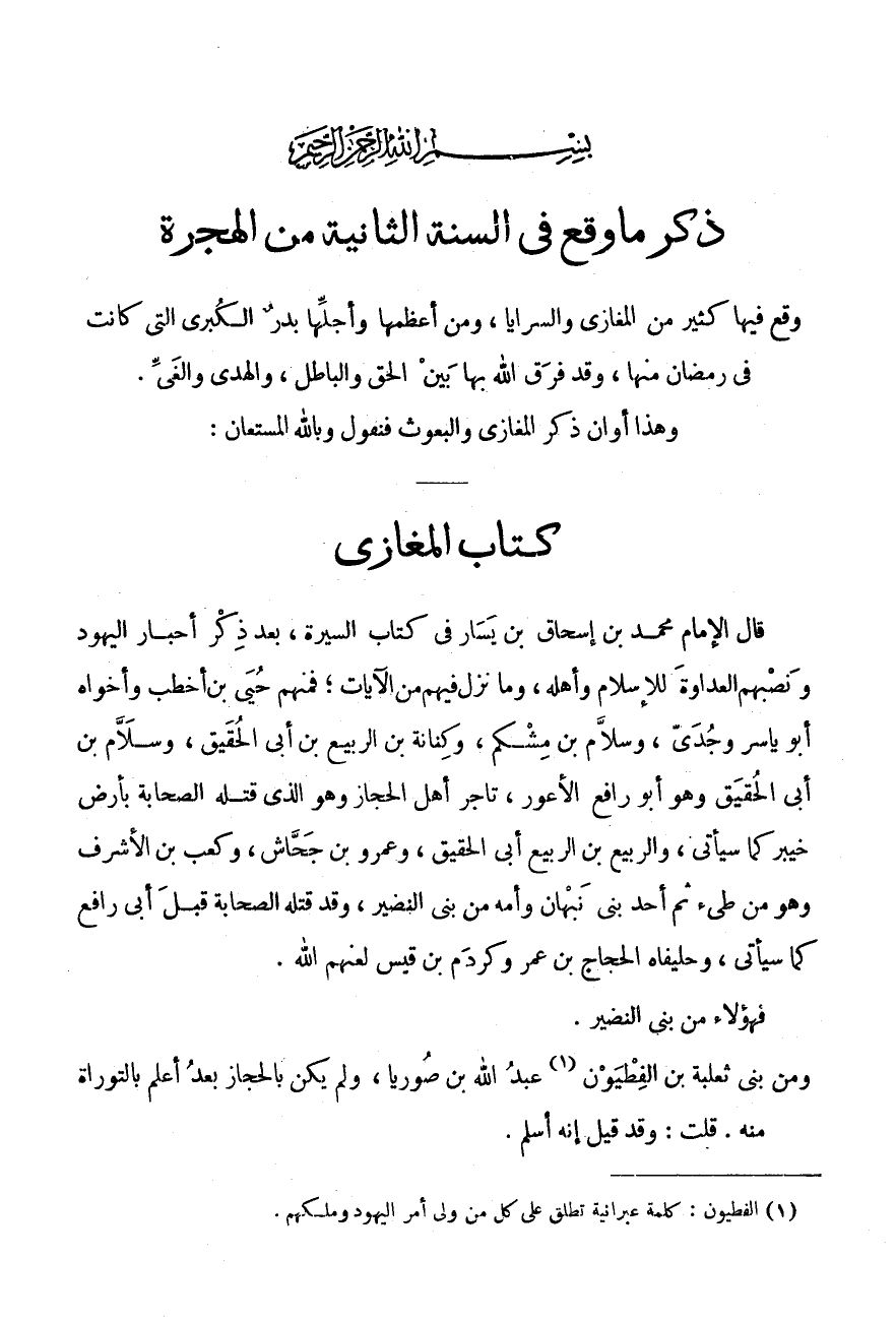 وَهَذَا أَوَانُ ذِكْرِ الْمَغَازِي وَالْبُعُوثِ فَنَقُولُ وَبِاللَّهِ الْمُسْتَعَانُ: كِتَابُ الْمَغَازِي قَالَ الْإِمَامُ مُحَمَّدُ بْنُ إِسْحَاقَ بْنِ يَسَارٍ فِي كتاب السِّيرَة، بعد ذكر أَحْبَارَ الْيَهُودِ وَنَصْبِهِمُ الْعَدَاوَةَ لِلْإِسْلَامِ وَأَهْلِهِ، وَمَا نَزَلَ فِيهِمْ مِنَ الْآيَاتِ، فَمِنْهُمْ حُيَيُّ بْنُ أَخْطَبَ وَأَخَوَاهُ أَبُو يَاسِرٍ وَجُدَيٌّ، وَسَلَّامُ بْنُ مِشْكَمٍ، وَكِنَانَةُ بْنُ الرَّبِيعِ بْنِ أَبِي الْحُقَيْقِ، وَسَلَّامُ بْنُ أَبِي الْحُقَيْقِ وَهُوَ أَبُو رَافِعٍ الْأَعْوَرُ، تَاجِرُ أَهْلِ الْحِجَازِ وَهُوَ الَّذِي قَتَلَهُ الصَّحَابَةُ بِأَرْضِ خَيْبَرَ كَمَا سَيَأْتِي، وَالرَّبِيعُ بْنُ الرّبيع أَبِي الْحُقَيْقِ، وَعَمْرُو بْنُ جِحَاشٍ، وَكَعْبُ بْنُ الاشرف وهم من طئ ثُمَّ أَحَدُ بَنِي نَبْهَانَ وَأُمُّهُ مِنْ بَنِي النَّضِيرِ، وَقَدْ قَتَلَهُ الصَّحَابَةُ قَبْلَ أَبِي رَافِعٍ كَمَا سَيَأْتِي، وحليفاه الْحجَّاج بن عمر وَكَرْدَمُ بْنُ قَيْسٍ لَعَنَهُمُ اللَّهُ.