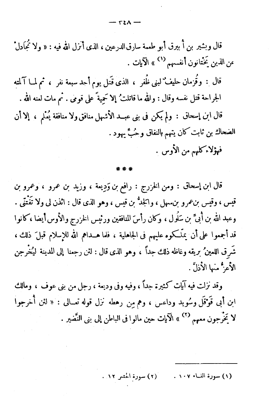 قَالَ وَبَشِيرُ بْنُ أُبَيْرِقٍ أَبُو طُعْمَةَ سَارِقُ الدِّرْعَيْنِ، الَّذِي أَنْزَلَ اللَّهُ فِيهِ: " وَلَا تُجَادِلْ عَن الَّذين يَخْتَانُونَ أنفسهم (1) " الْآيَاتِ.